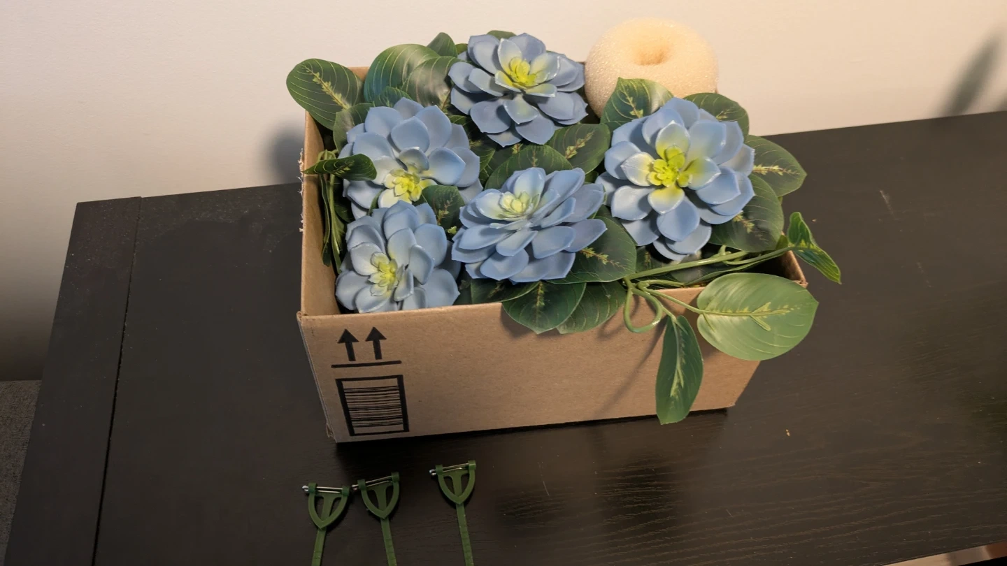 Selling a box of miscellaneous wedding decorations and supplies. Includes two fake garlands of leaves, blue flowers (pictured), boutonnière clips, and hair donut bun maker.
