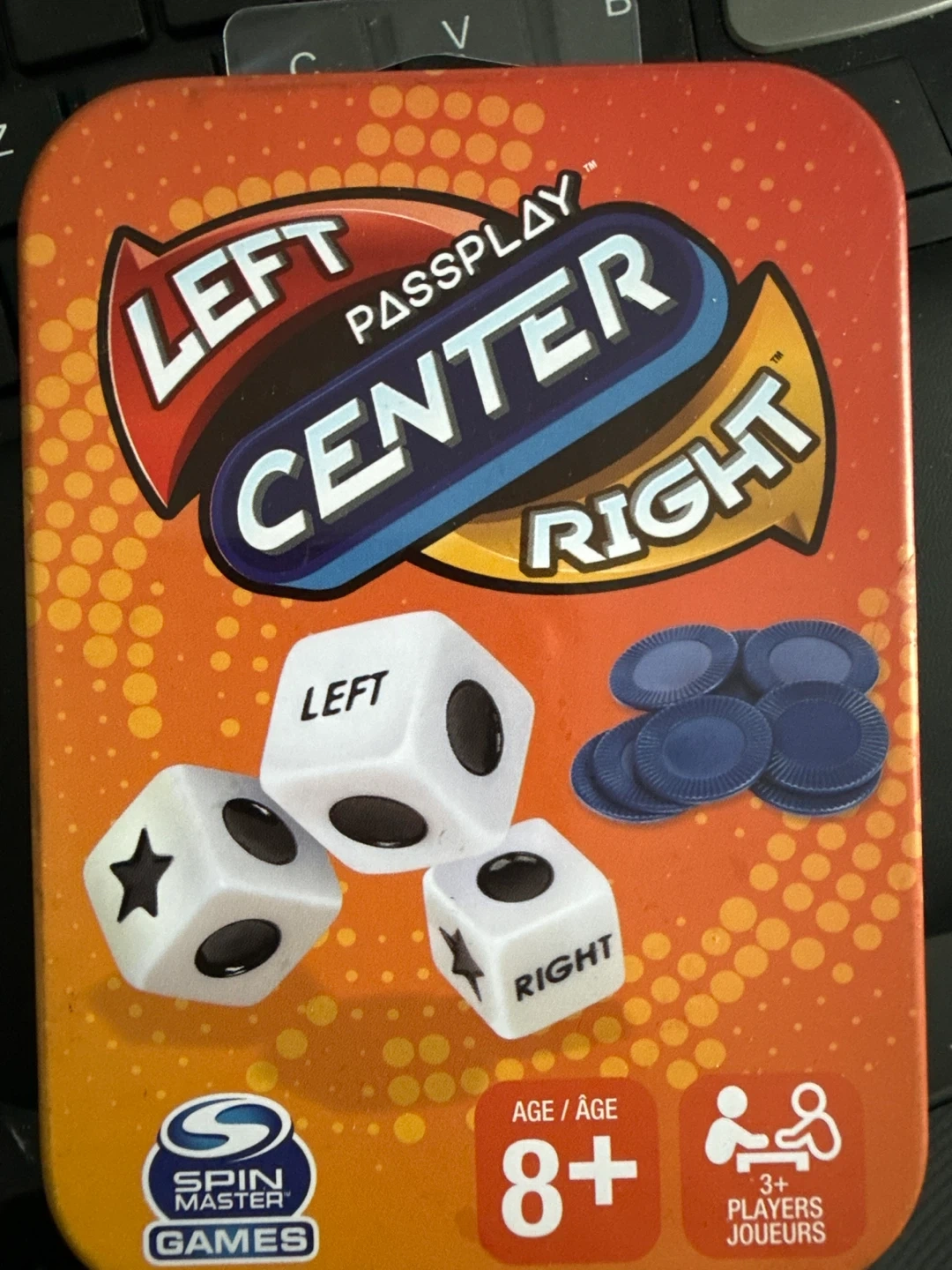 Selling a Left Center Right dice game by Spin Master! This game is perfect for ages 8 and up and can be played with 3 or more players. It includes dice and chips in a convenient tin for easy storage and travel