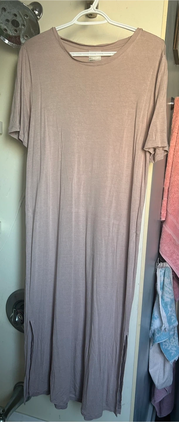 Selling a long rose colour T-shirt dress from H&M. It's a size large and has a nice, relaxed fit. Perfect for casual wear or layering!