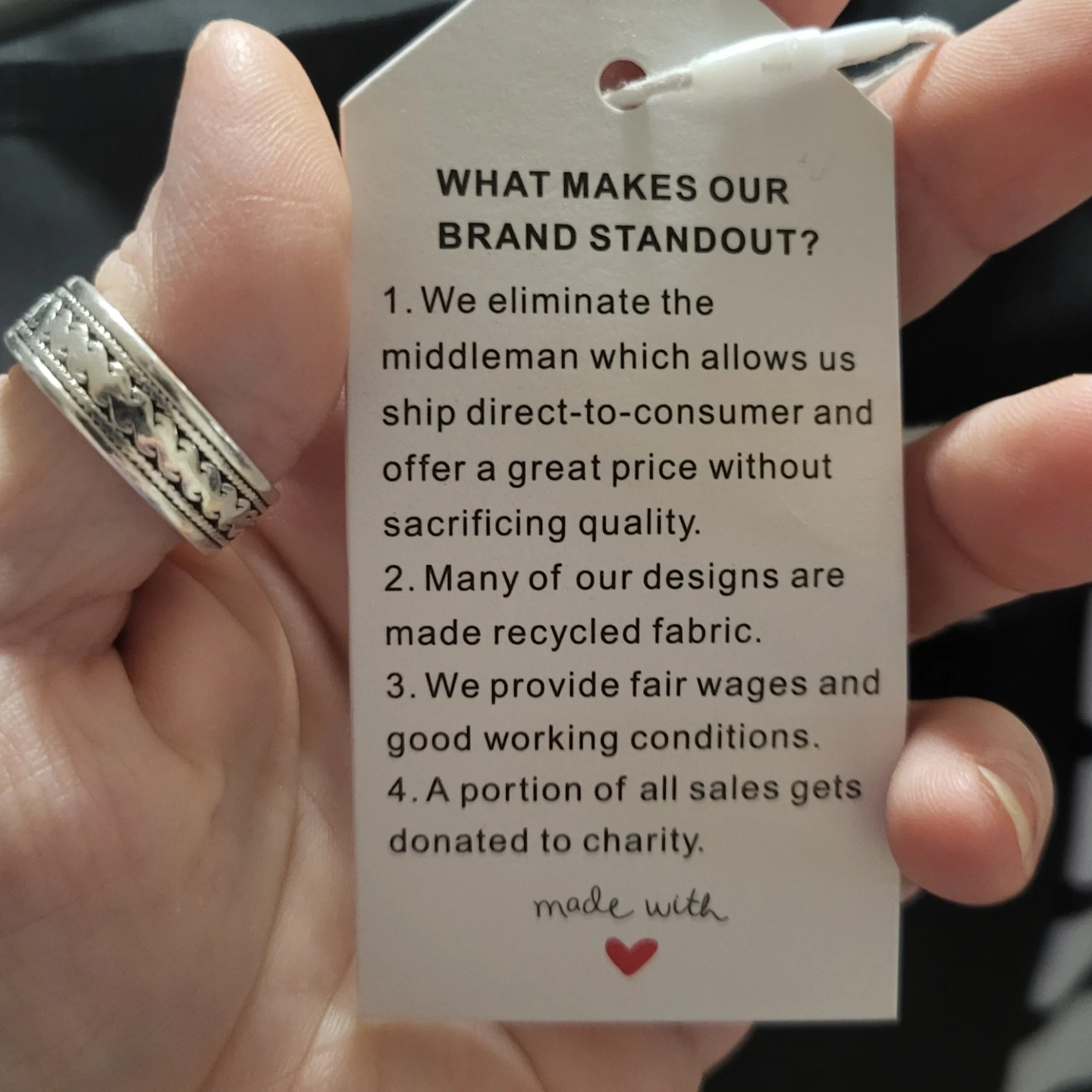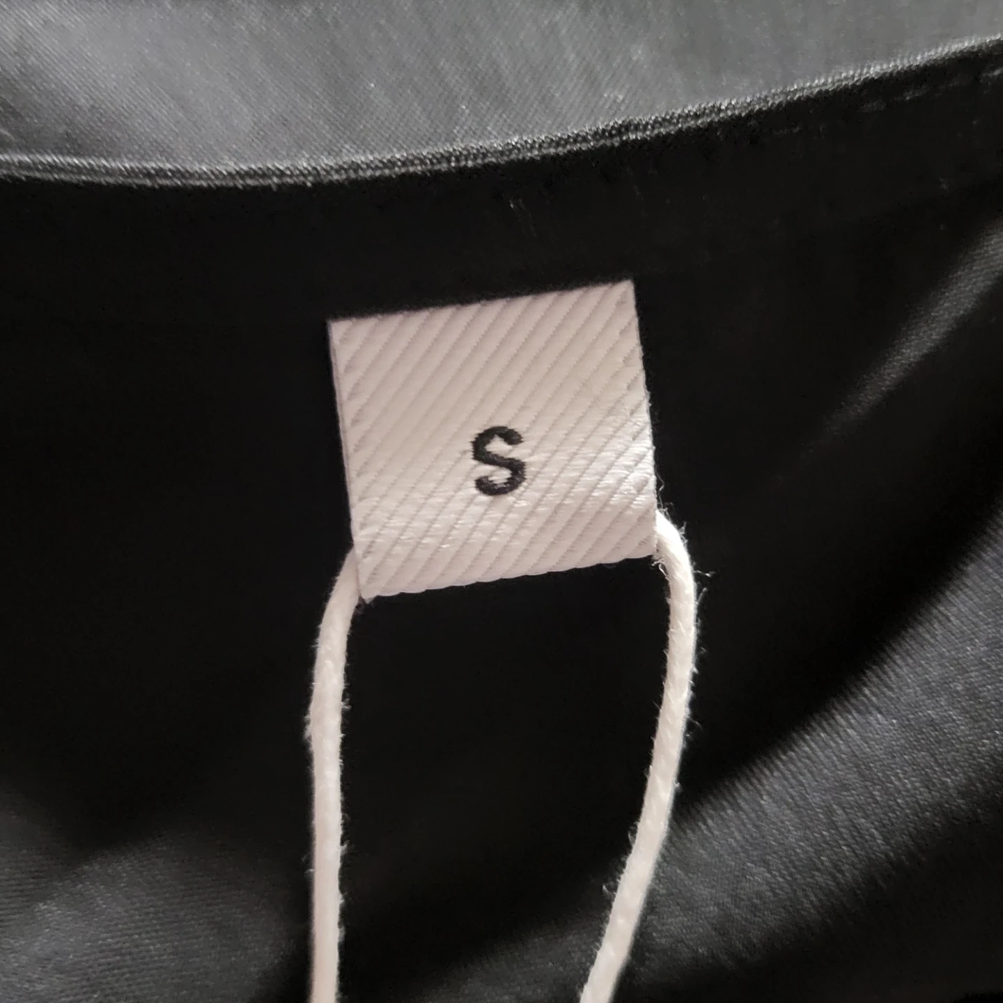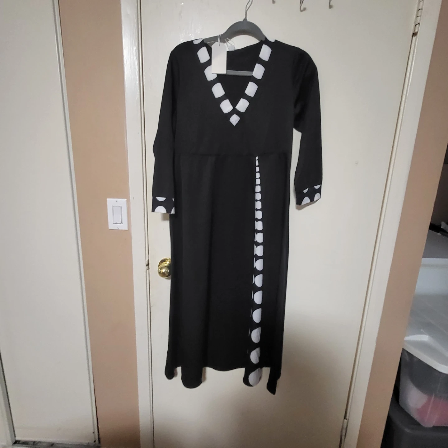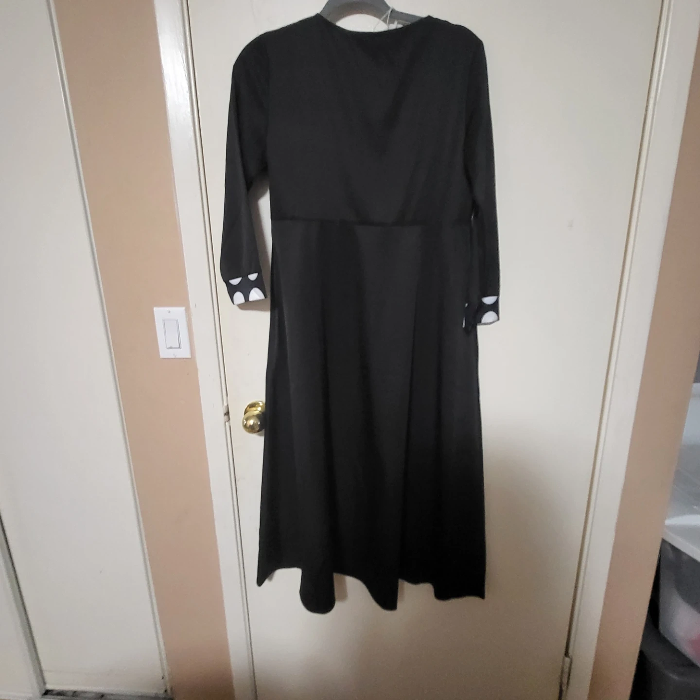 Selling a cute black dress in size small! It has a unique design with white accents. The brand is focused on using recycled fabrics and donating to charity, so you can feel good about your purchase!