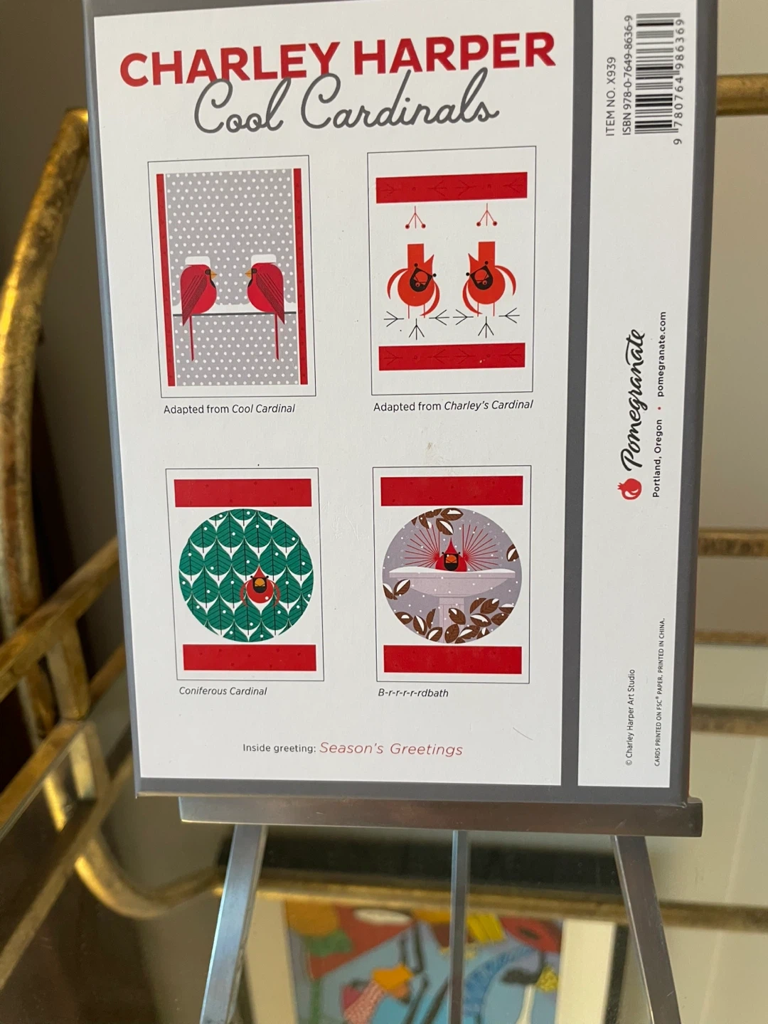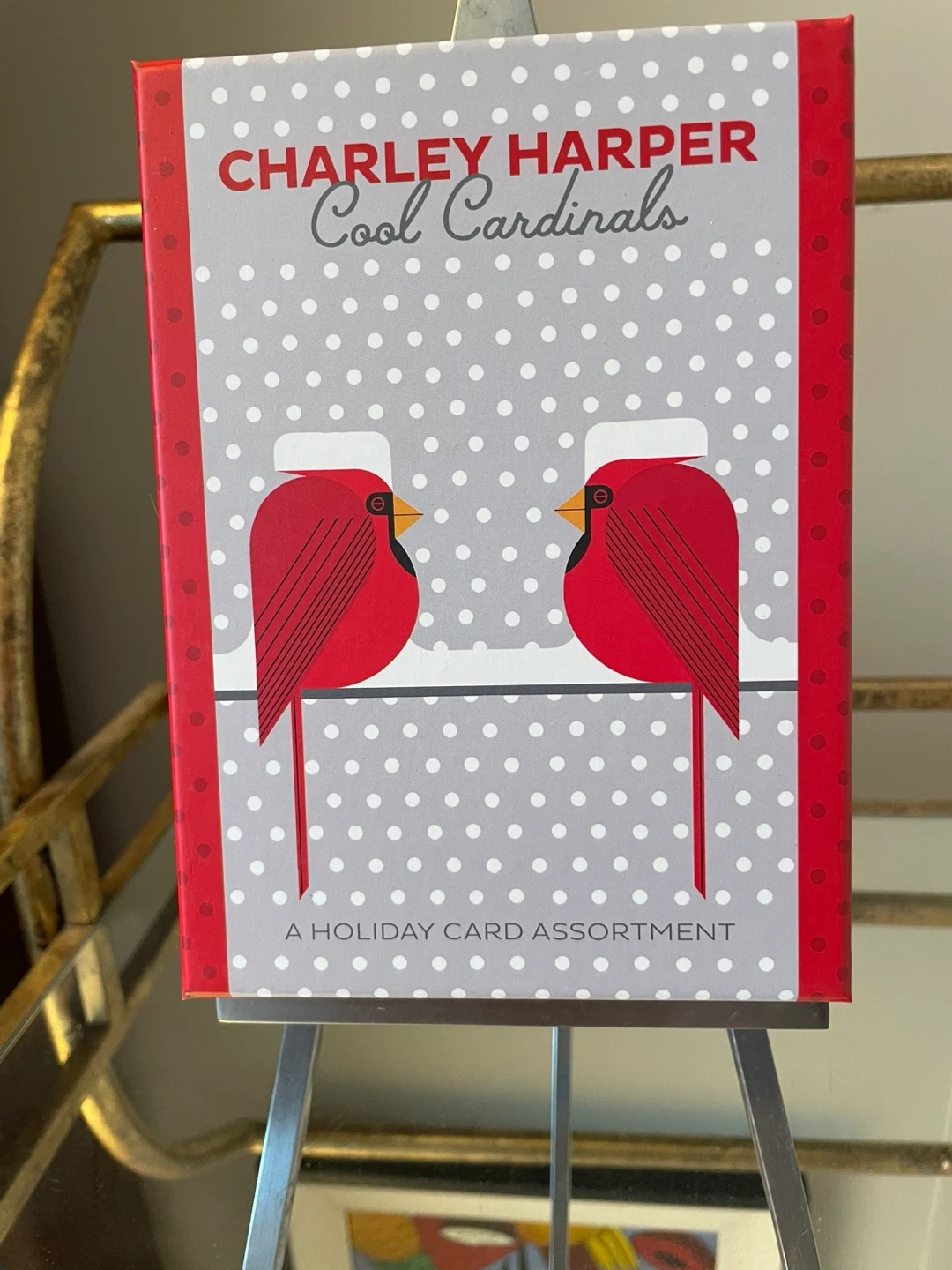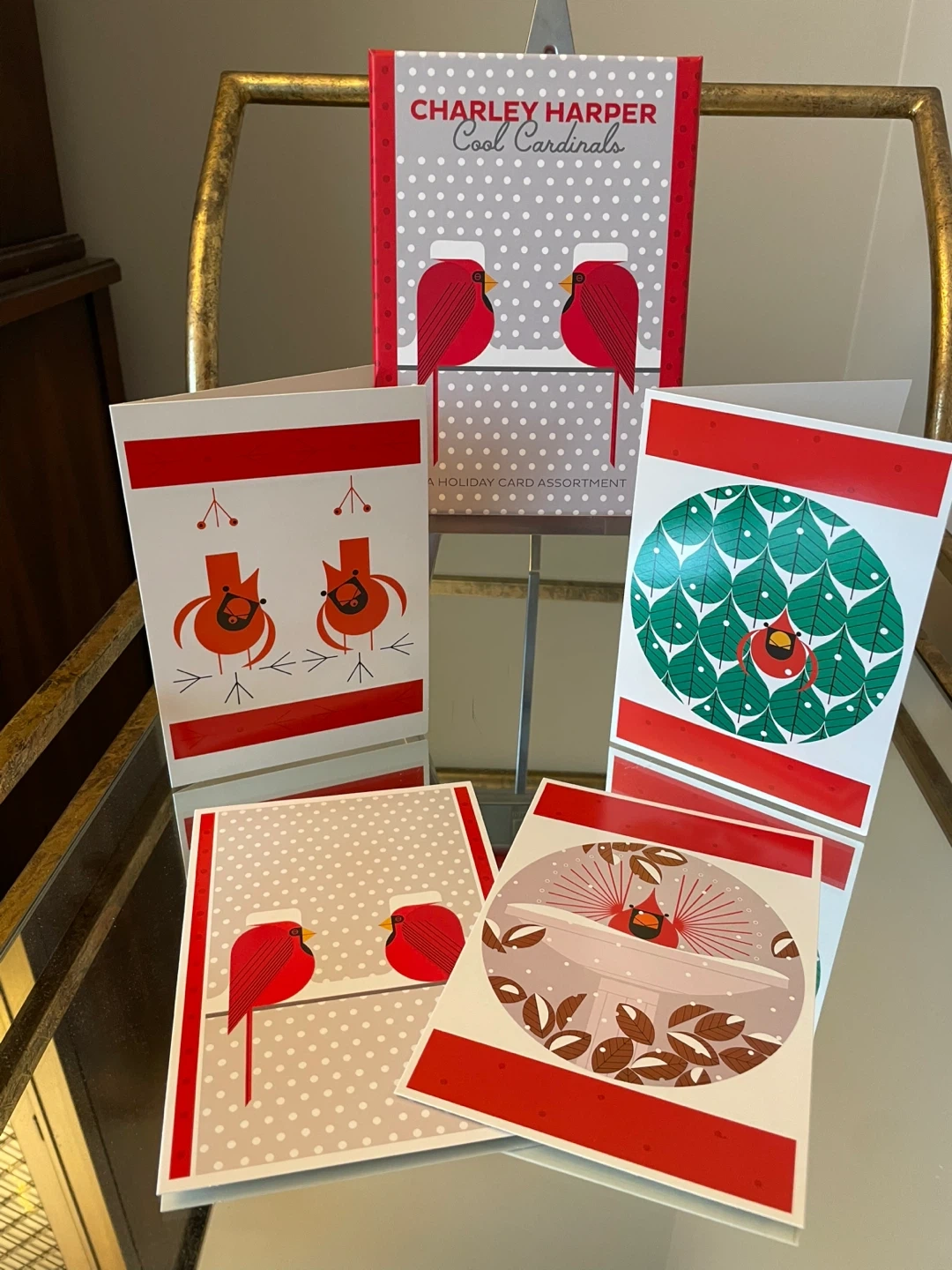 Selling a Charley Harper Cool Cardinals holiday card assortment. The box includes cards with unique designs featuring stylized cardinals and winter scenes. Perfect for sending festive greetings to friends and family for the holiday season.