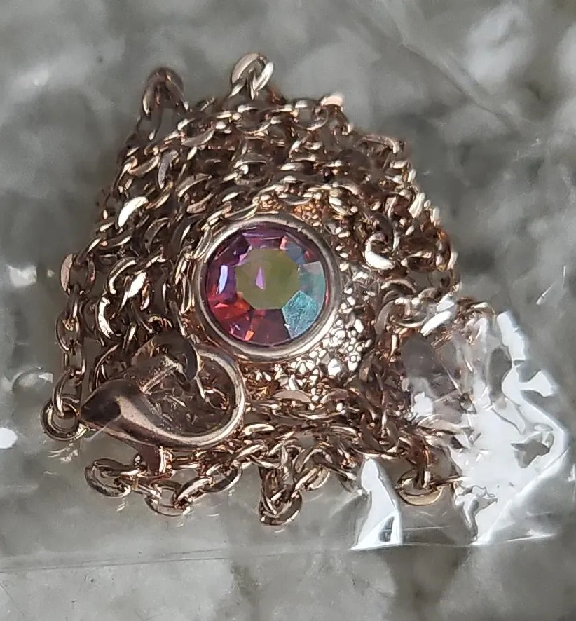 Selling a rose gold tone chain necklace. It features a colourful iridescent stone in the centre. The necklace is in great condition and ready to add a touch of sparkle to your outfit