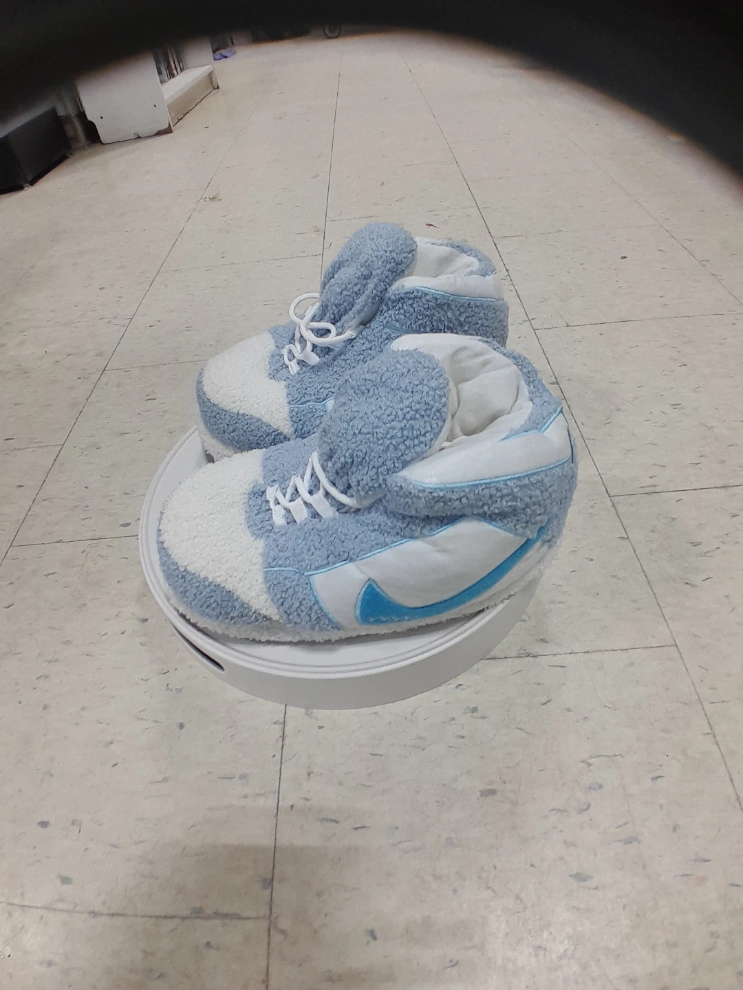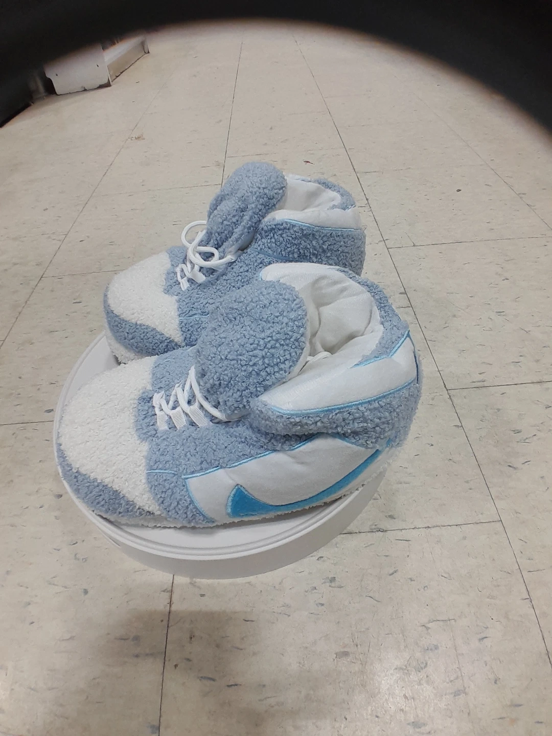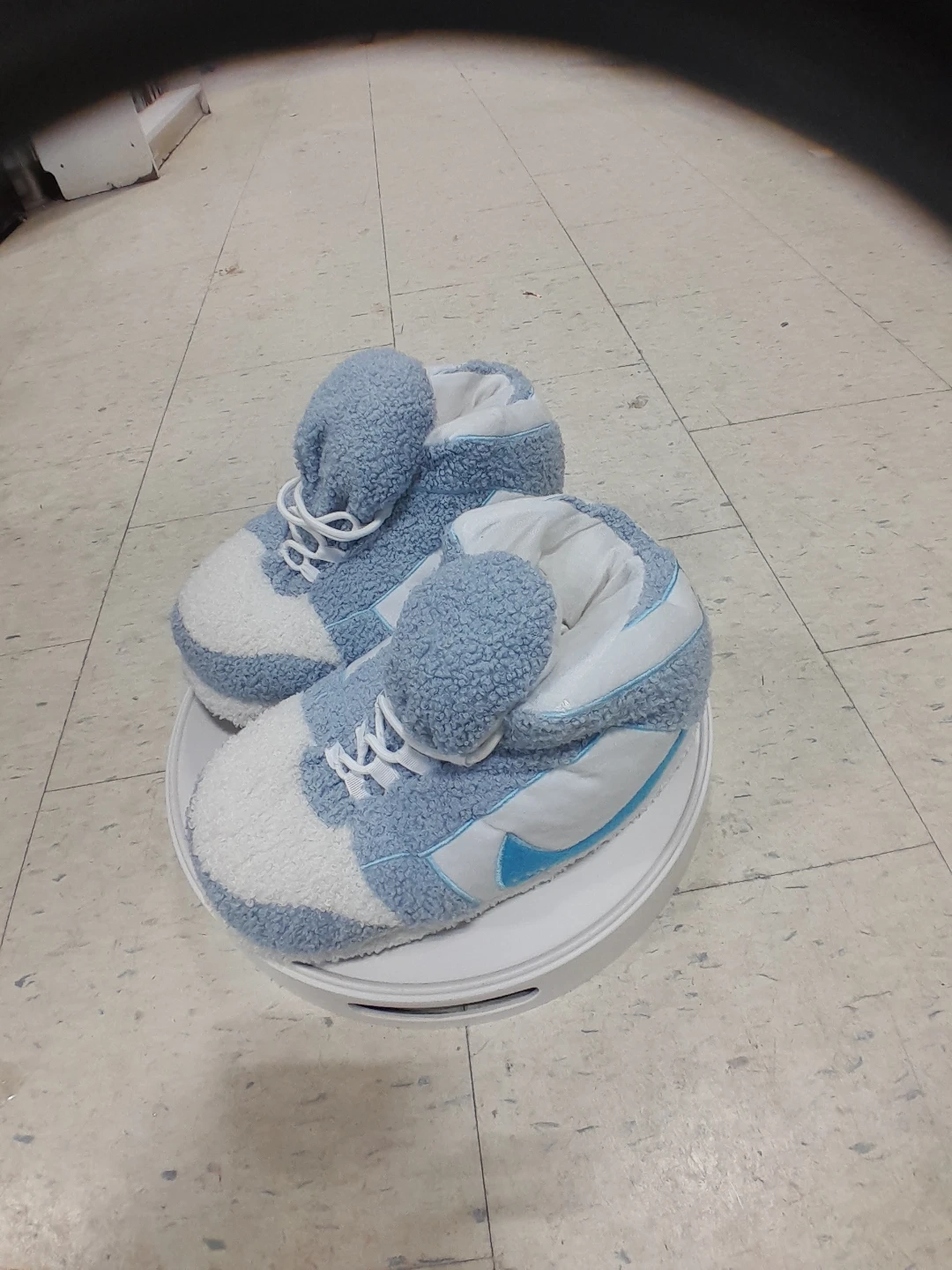 Super cute Nike fuzzy slipper shoes! They are blue and white and look like sneakers. Perfect for keeping your feet warm and cozy around the house