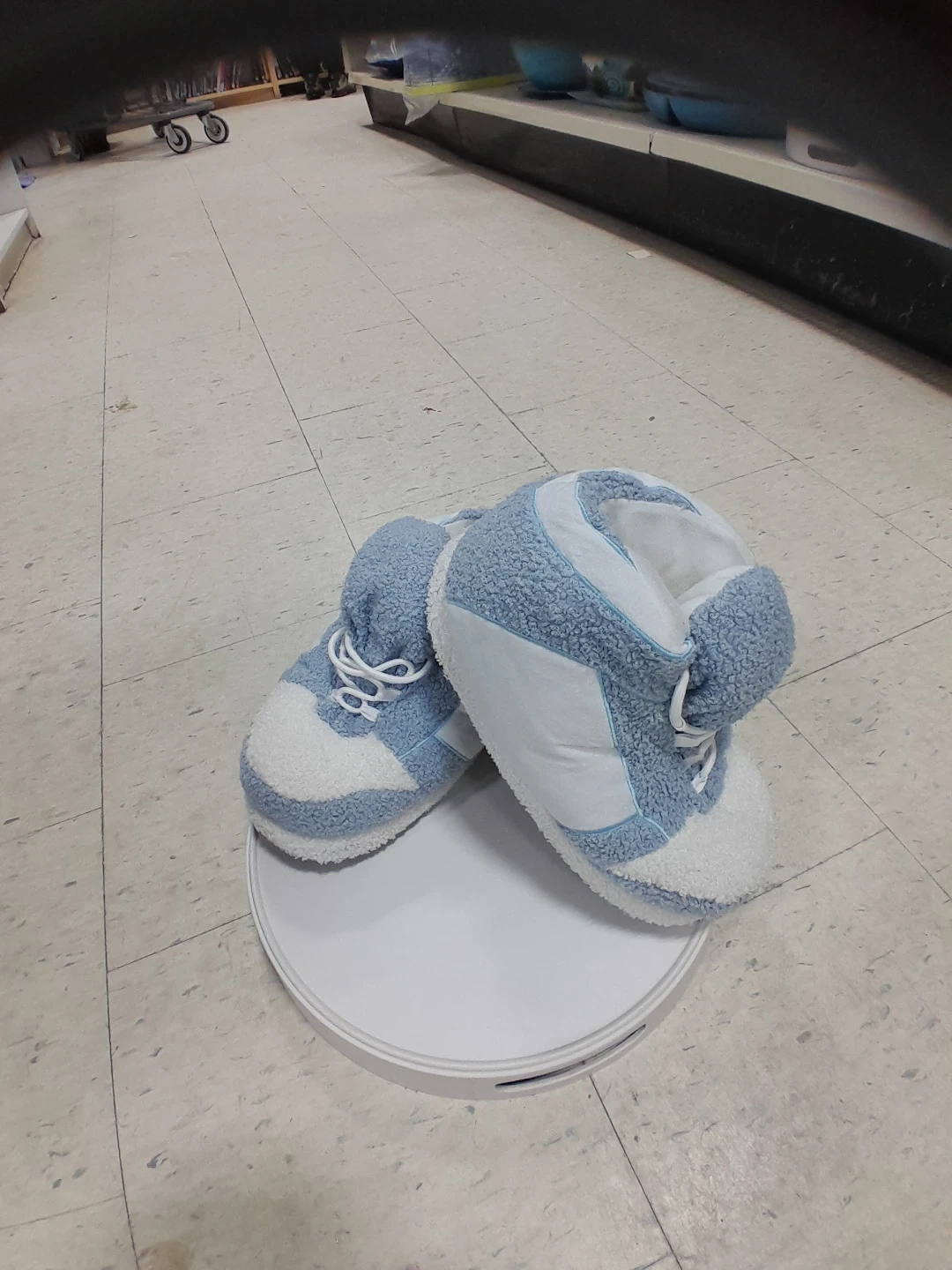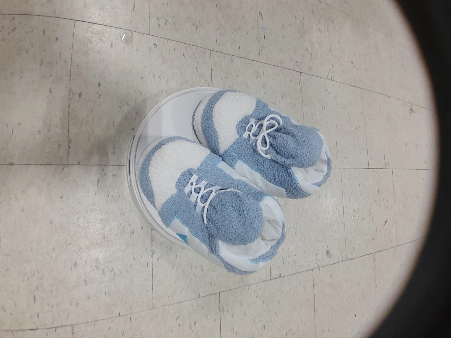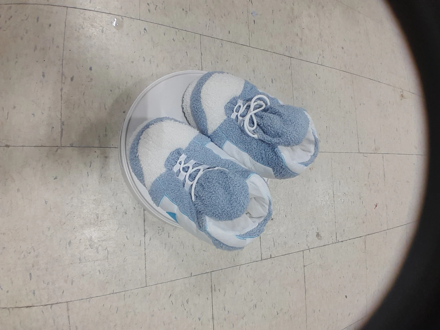Super cute Nike fuzzy slipper shoes! They are blue and white and look like sneakers. Perfect for keeping your feet warm and cozy around the house
