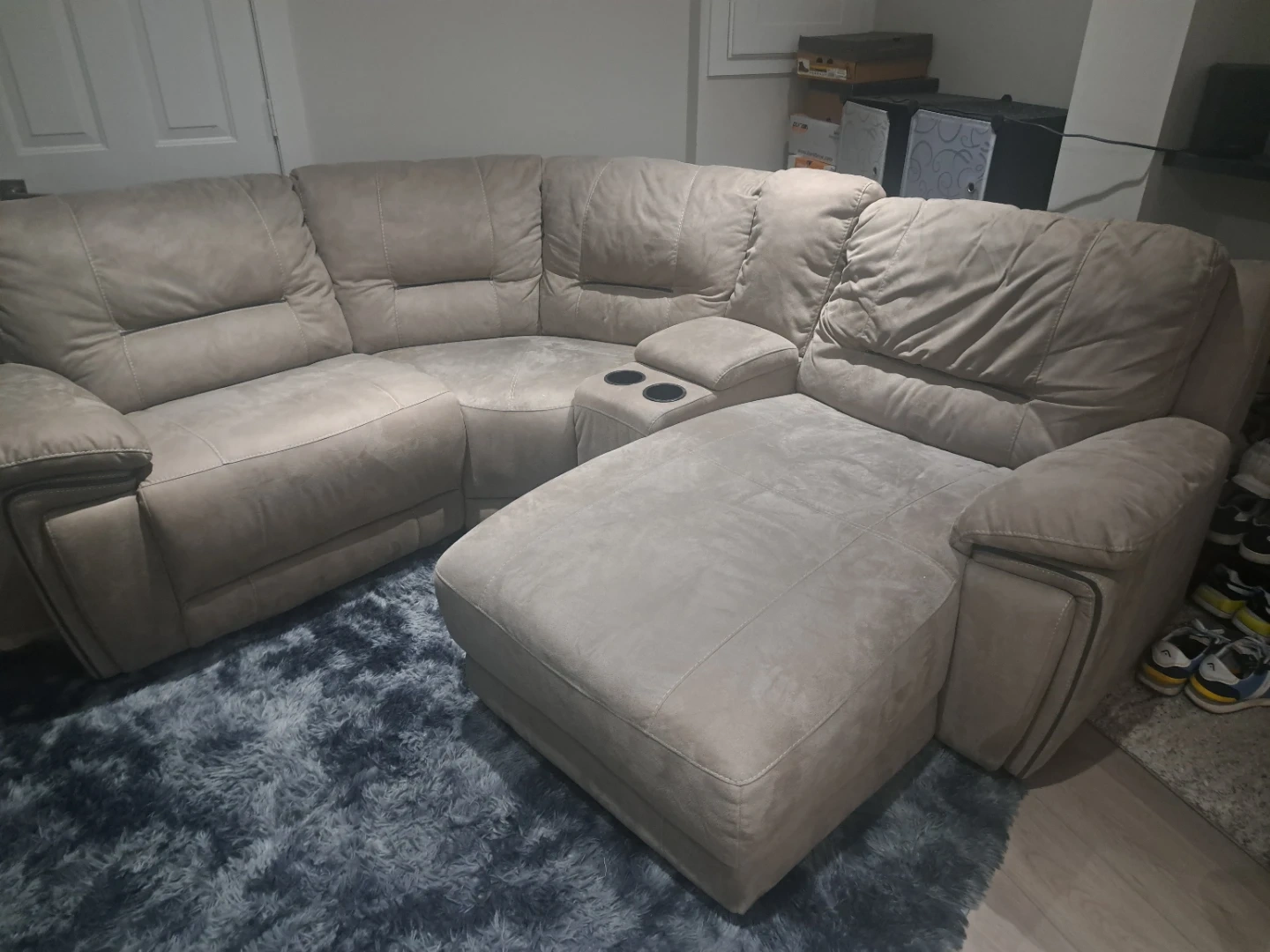 Selling a comfy beige sectional sofa! It features a chaise lounge and convenient cup holders. Perfect for a cozy living room setup!