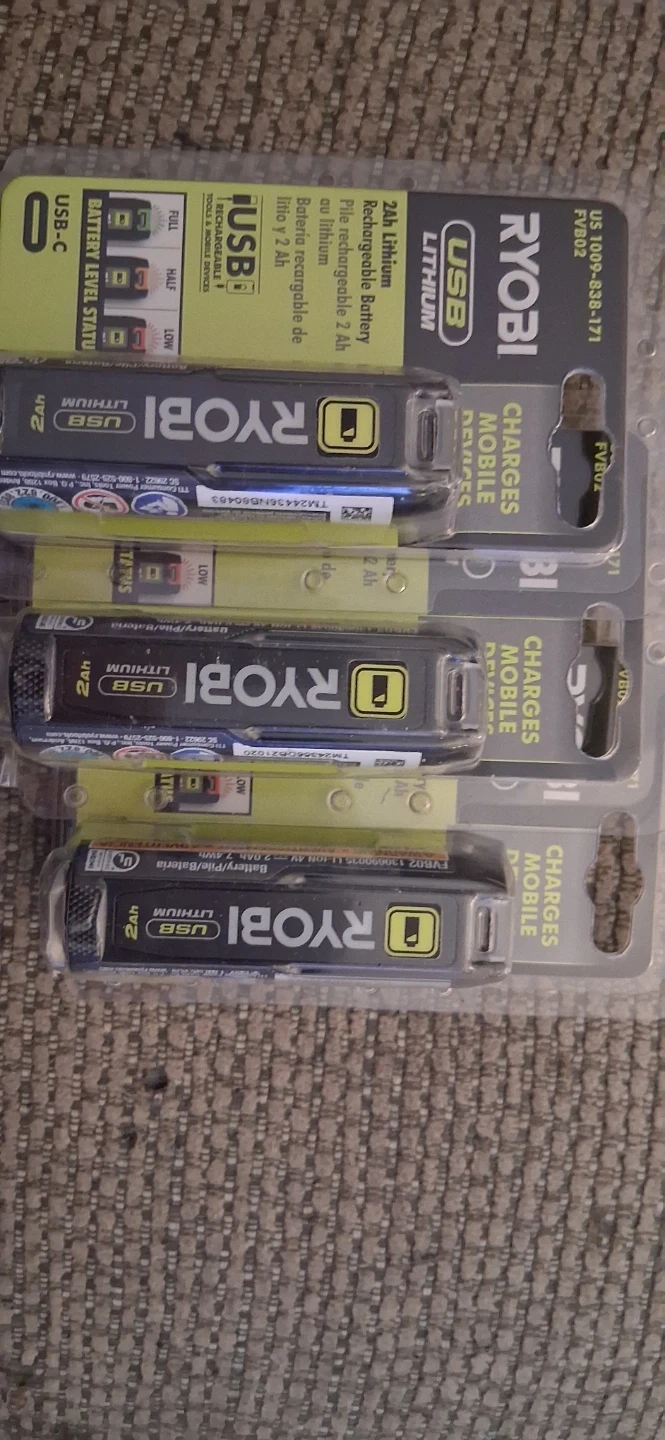 I have 3 new Ryobi USB Lithium 2Ah rechargeable battery for sale! It's still in its original packaging and ready to go. This battery is USB-C compatible and features a battery level status indicator, so you always know how much power you have left. Great for Ryobi USB Lithium tools! $45 for all 3