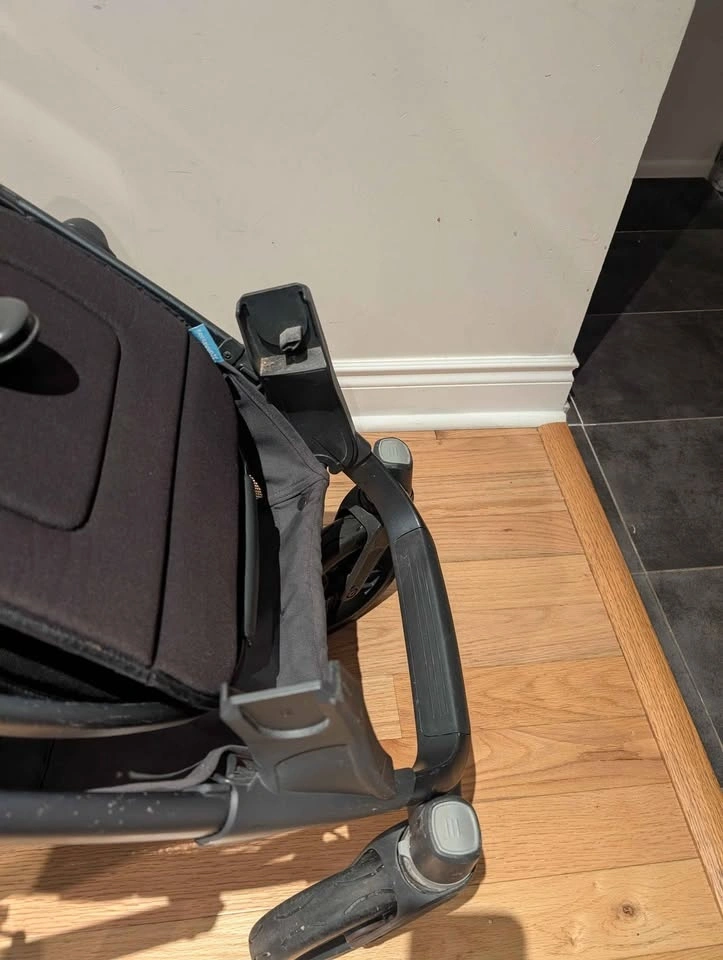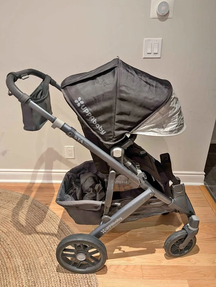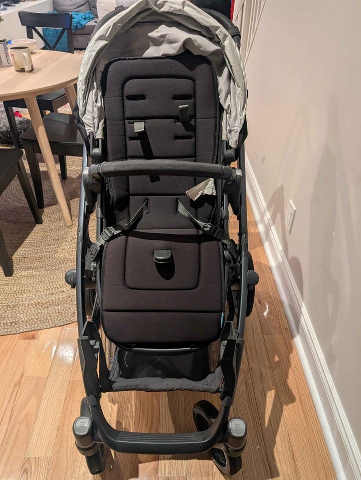 Has been well maintained and some wear and tare. Comes with bassinet and lots of extra accessories. Clips for extra chair, hook, cup holder, seat cushion