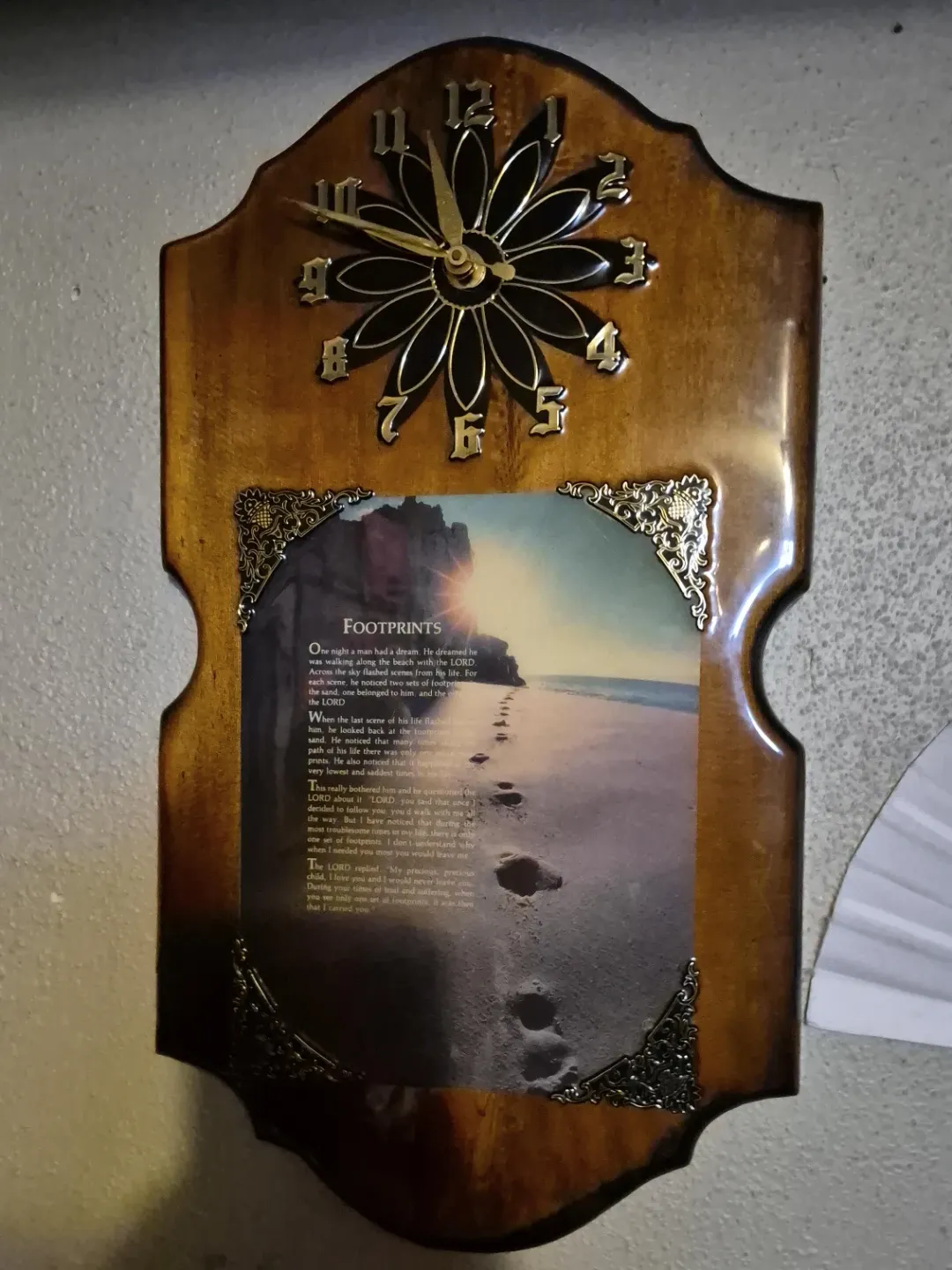 This is a unique wall clock with a wooden frame and a picture of "Footprints" at the bottom. The clock face has a floral design with gold-coloured numbers and hands. It's a lovely piece for any room