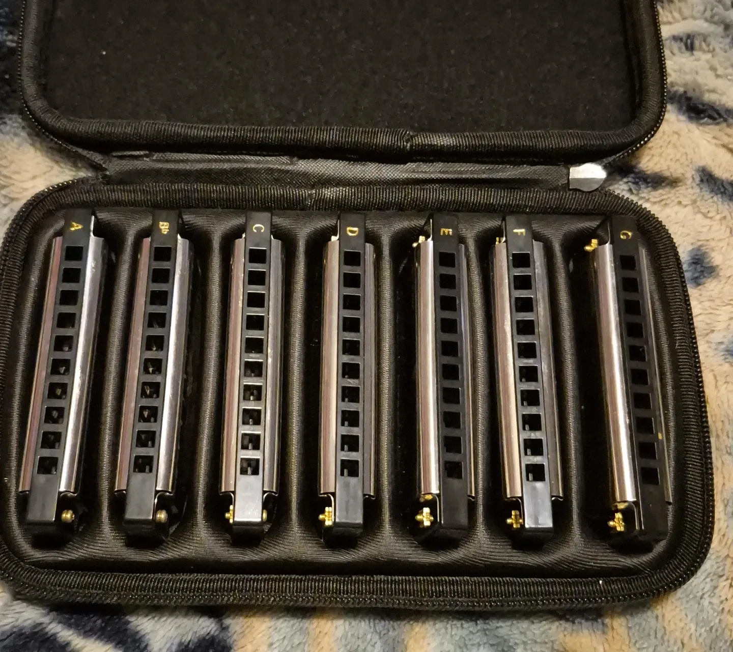 Selling a complete set of harmonicas in a convenient case. Each harmonica is labeled with a different key (A, Bb, C, D, E, F, G), making it great for learning or playing a variety of tunes. The set is in good condition and ready for a new musician to enjoy!
