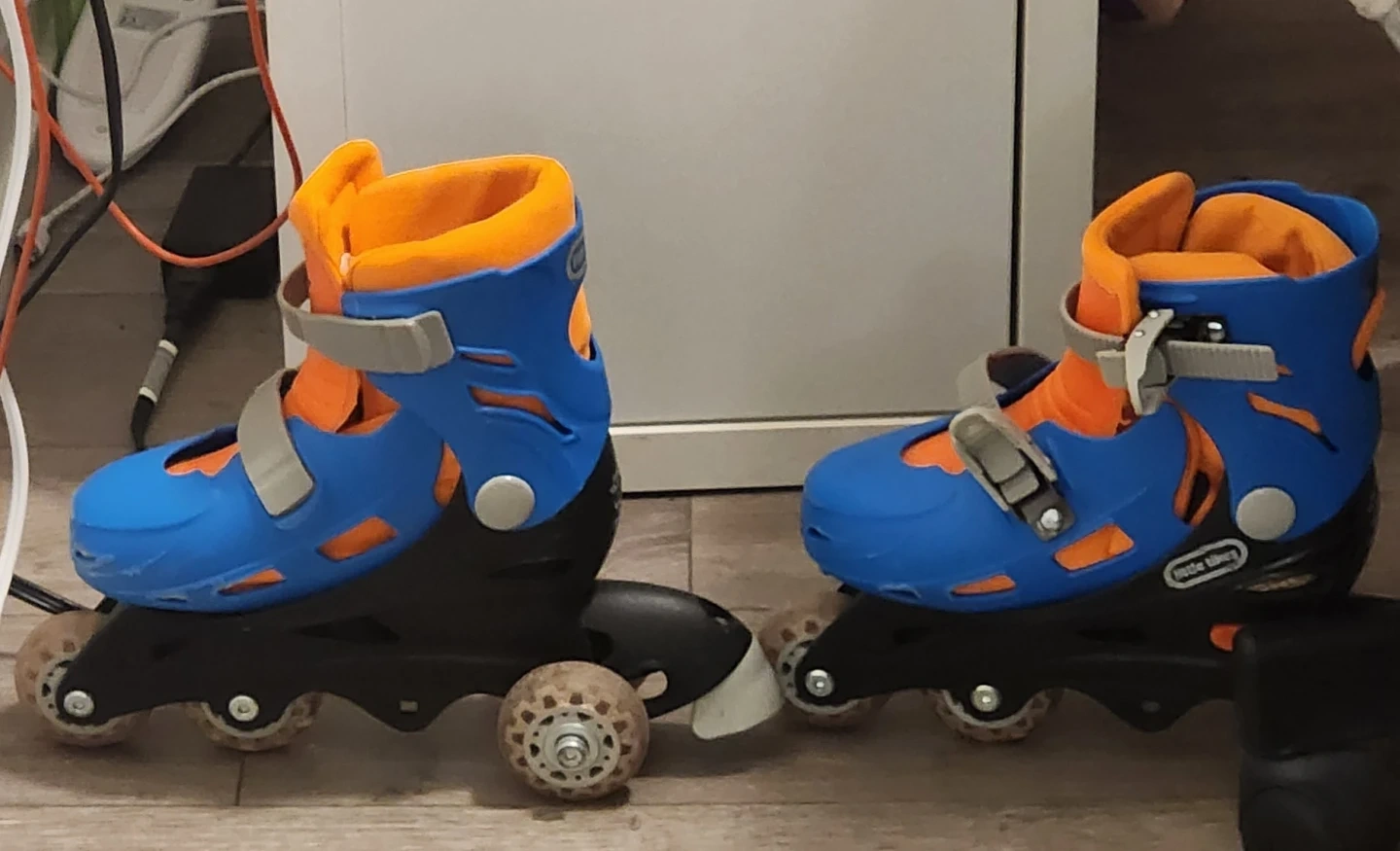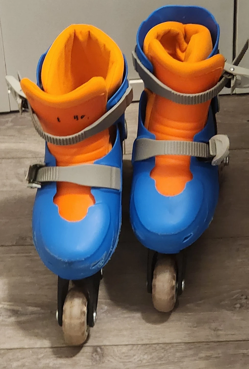 Selling a pair of kids' roller skates, perfect for some outdoor fun! They're blue and orange.