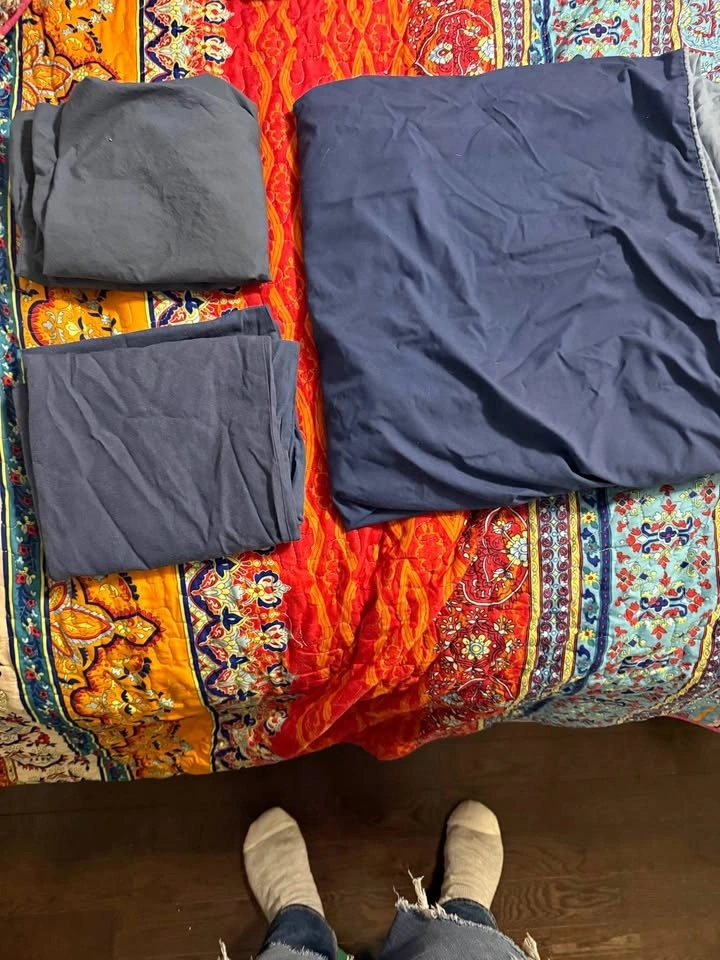 Blue duvet cover with two pillowcases because one pillowcase is lonely and we don’t support that energy.
