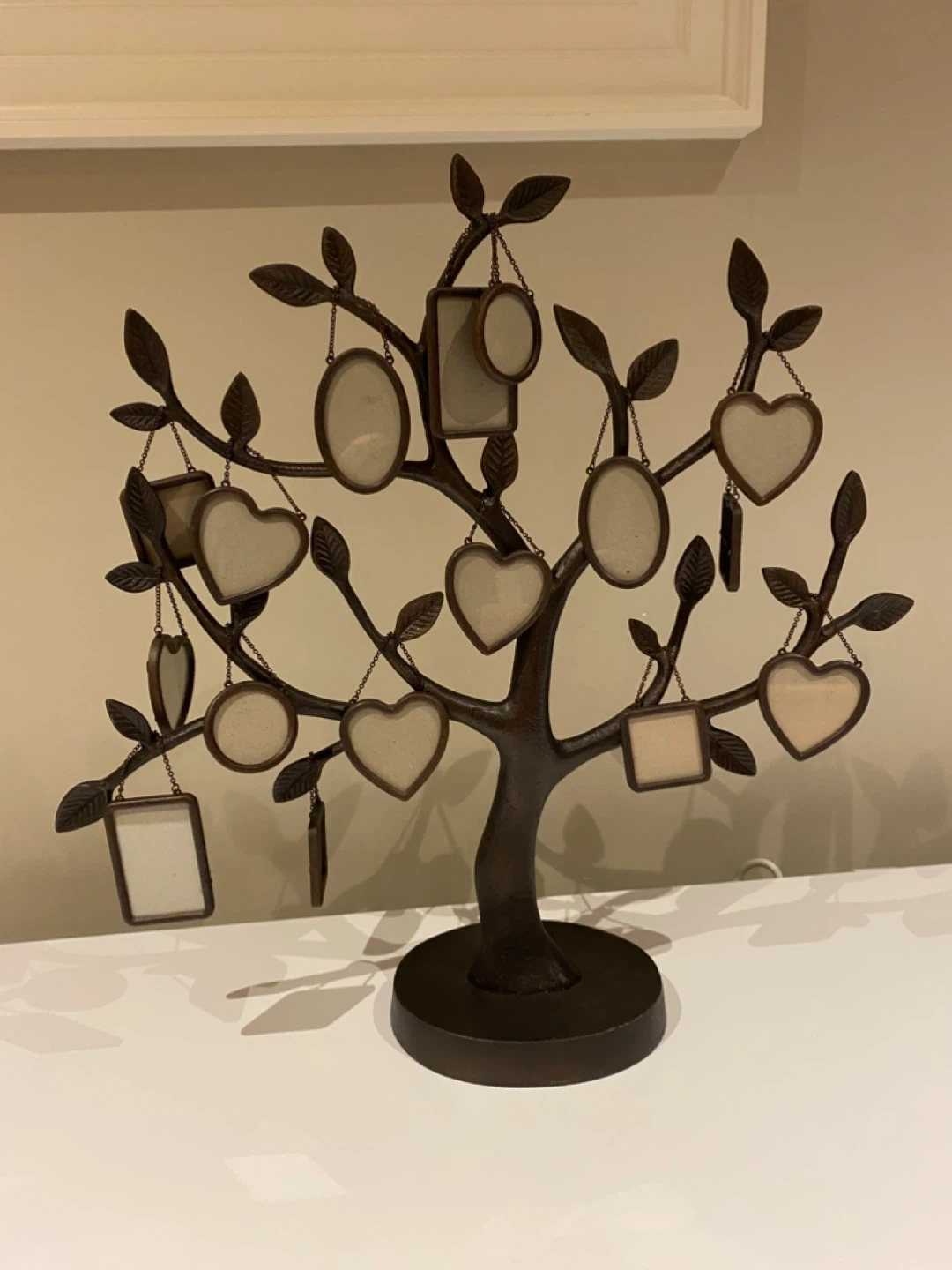 Decorative photo holder. Holds 16 frames in different shapes - hearts, oval, round and rectangle. Excellent condition. Never been used.