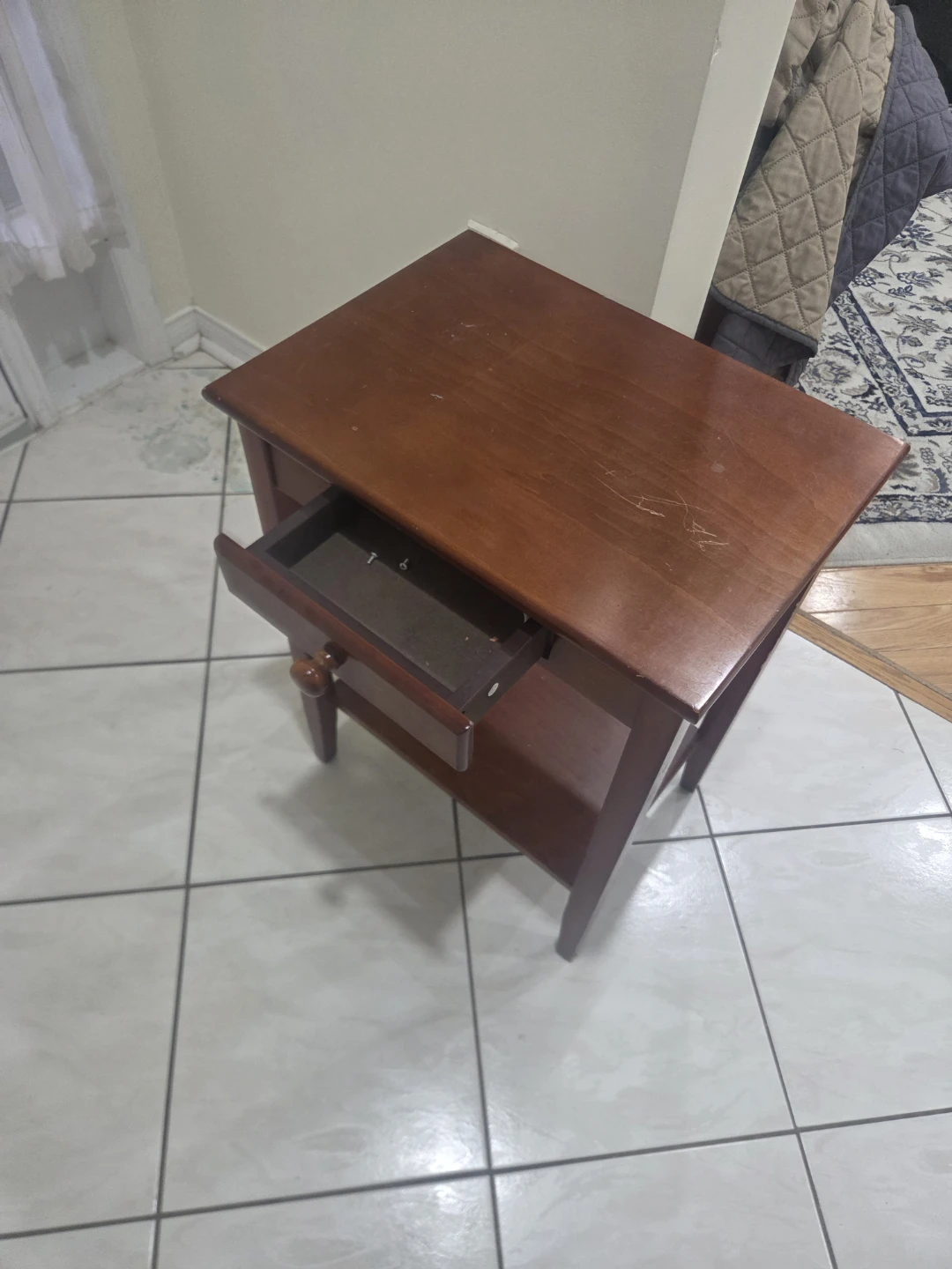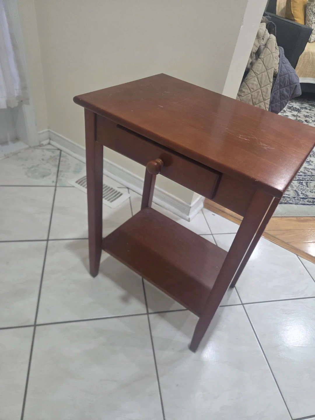 A cute wooden side table, perfect for a bedside or living room addition! It features a small drawer and a shelf for extra storage. There are some minor scratches on the top surface, but overall it's in good condition