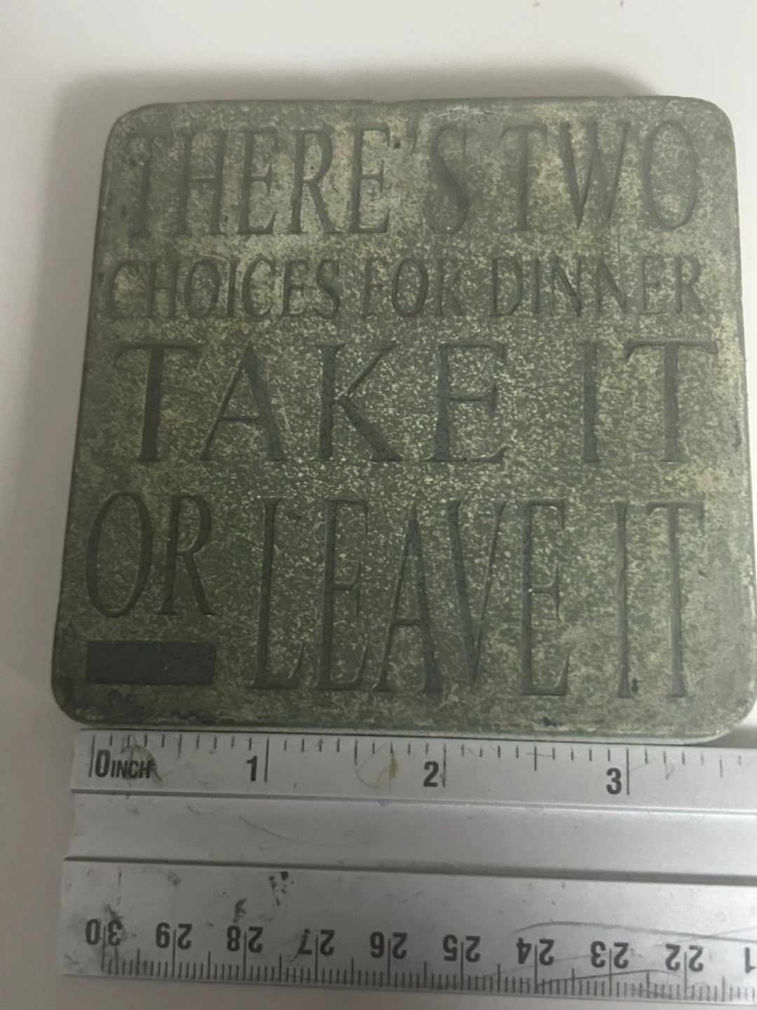 This plaque or coaster has a stone-like appearance and features the saying, "There's two choices for dinner: Take it or Leave it". It's about 3 inches wide