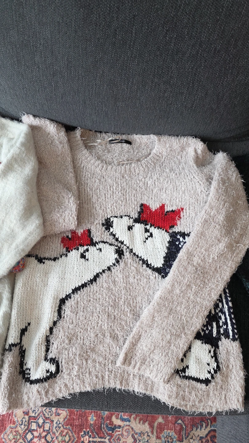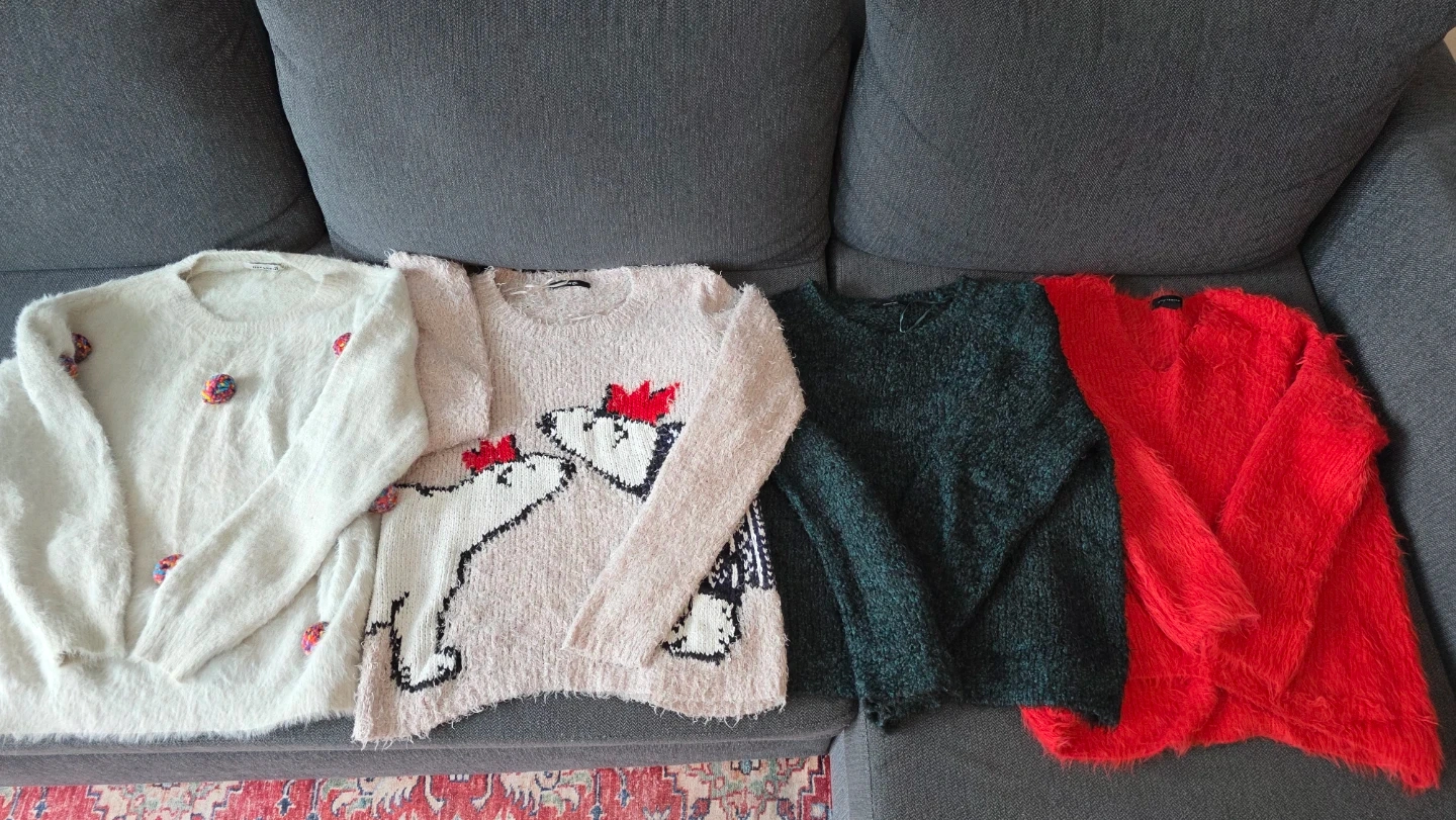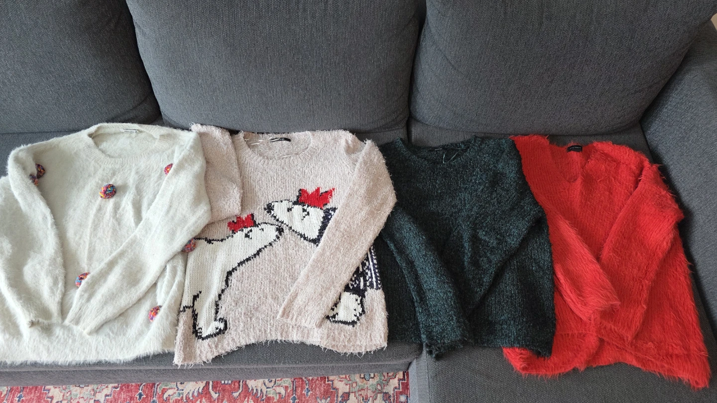 A selection of sweaters in various colours, including white, beige with a Snoopy design, green, and red.