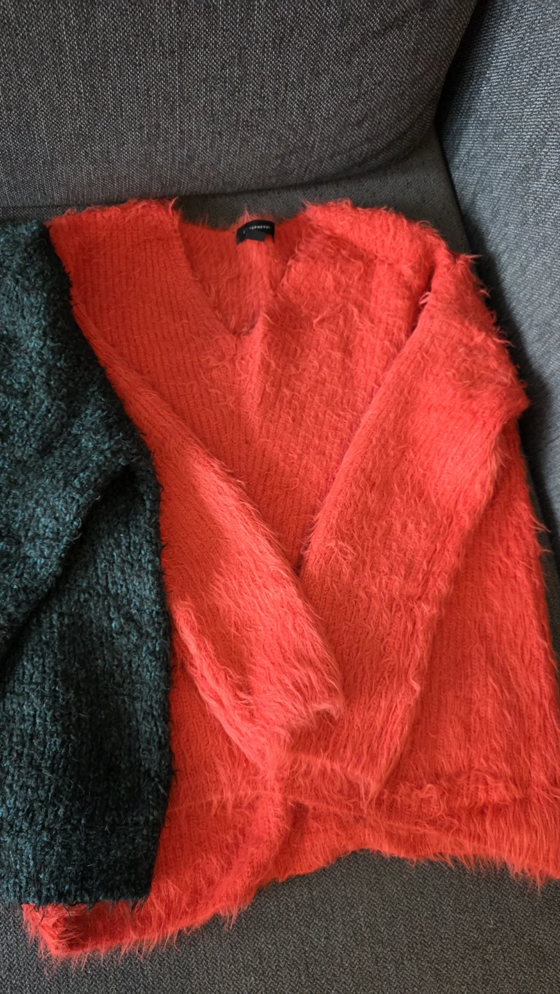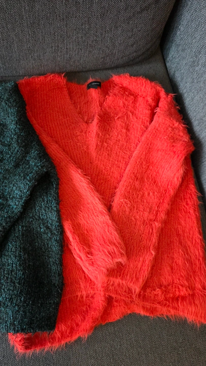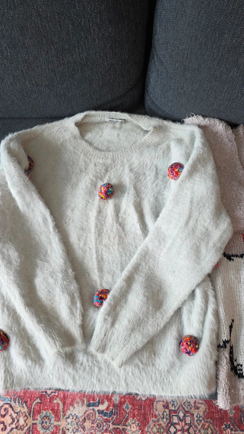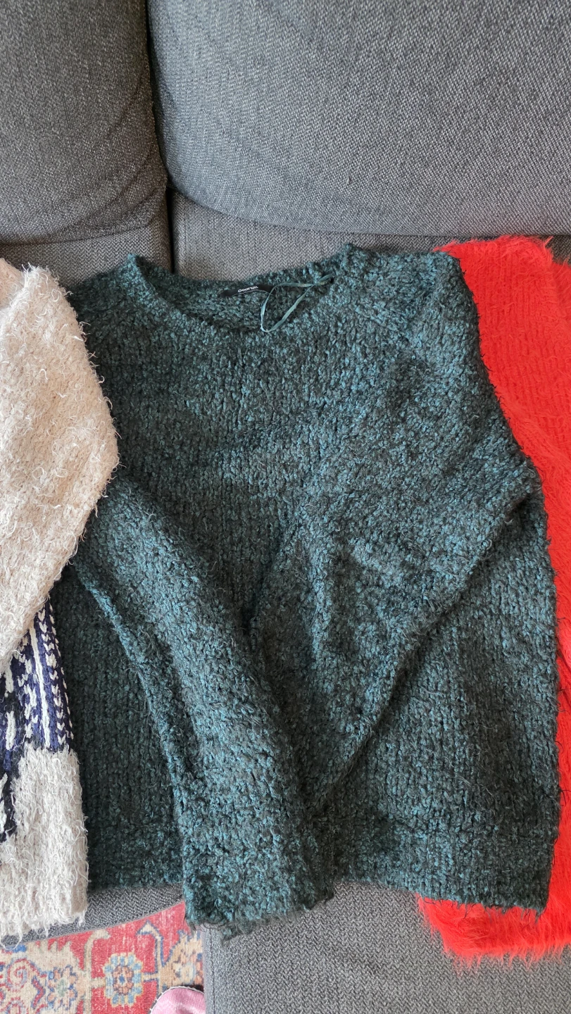 A selection of sweaters in various colours, including white, beige with a Snoopy design, green, and red.