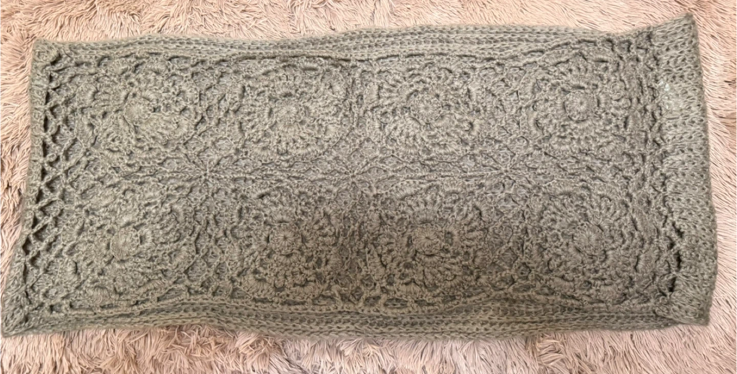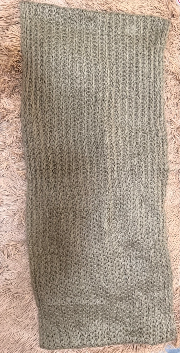 Selling a cozy, handmade knit scarf in a lovely olive green colour. It's perfect for keeping warm during the colder months. The scarf features a unique knit pattern, adding a touch of style to any outfit. It's in great condition and ready for a new owner!
