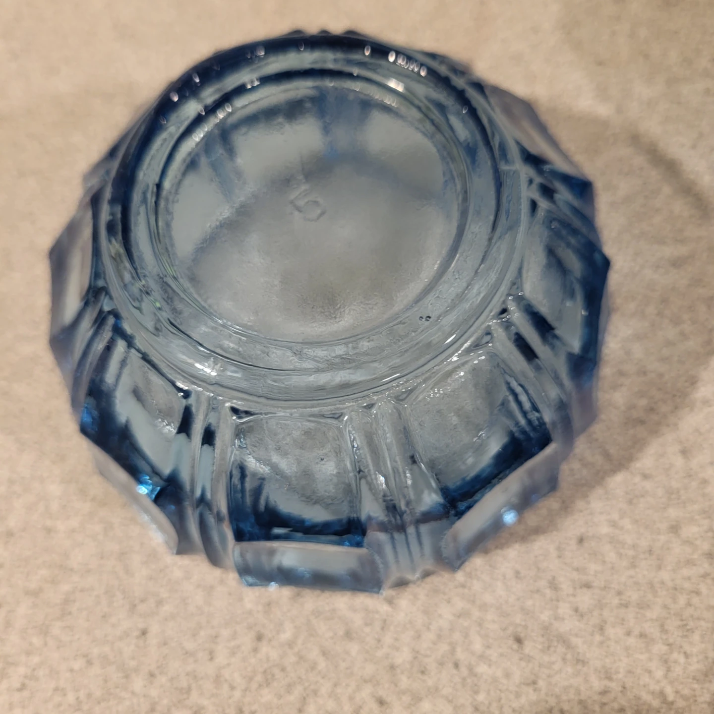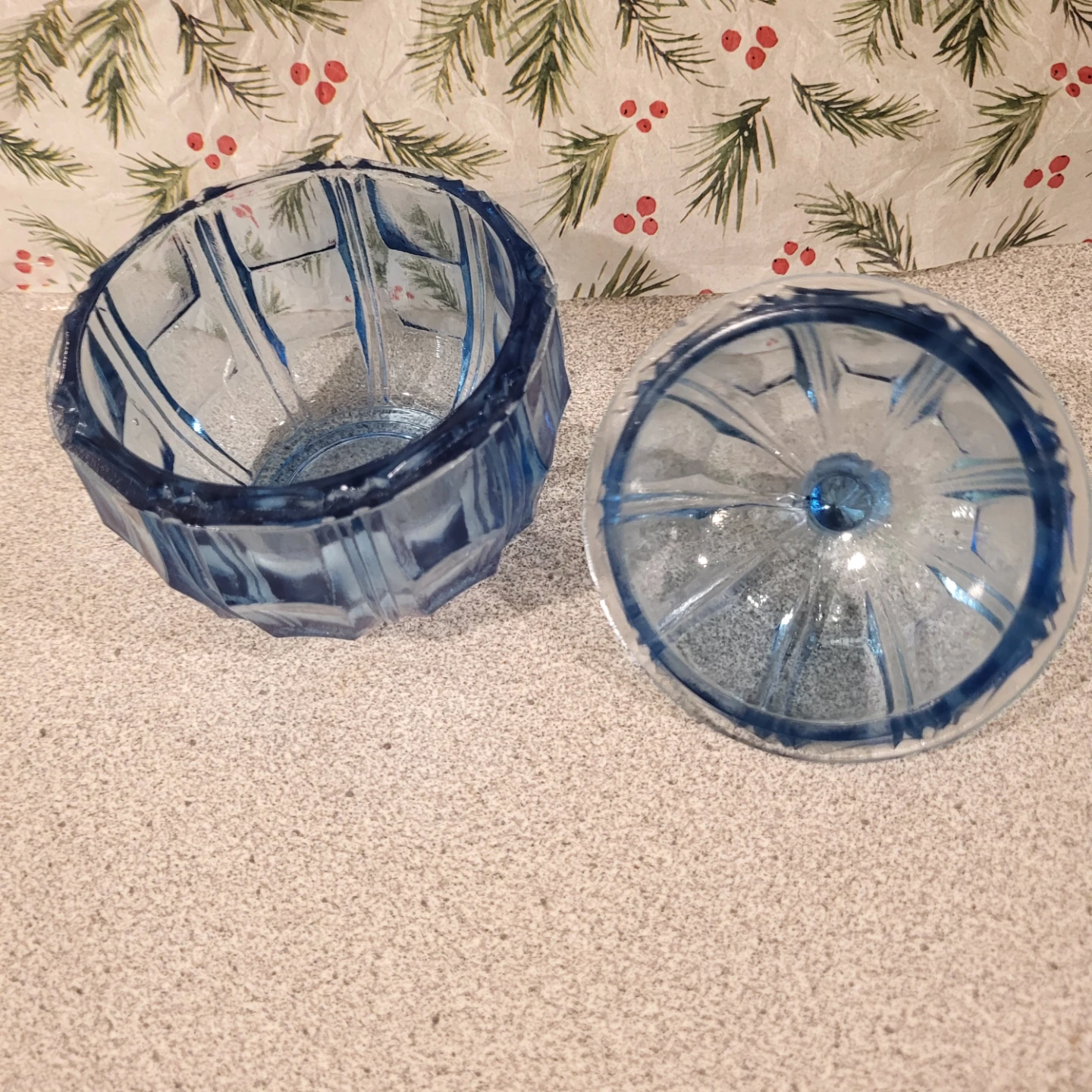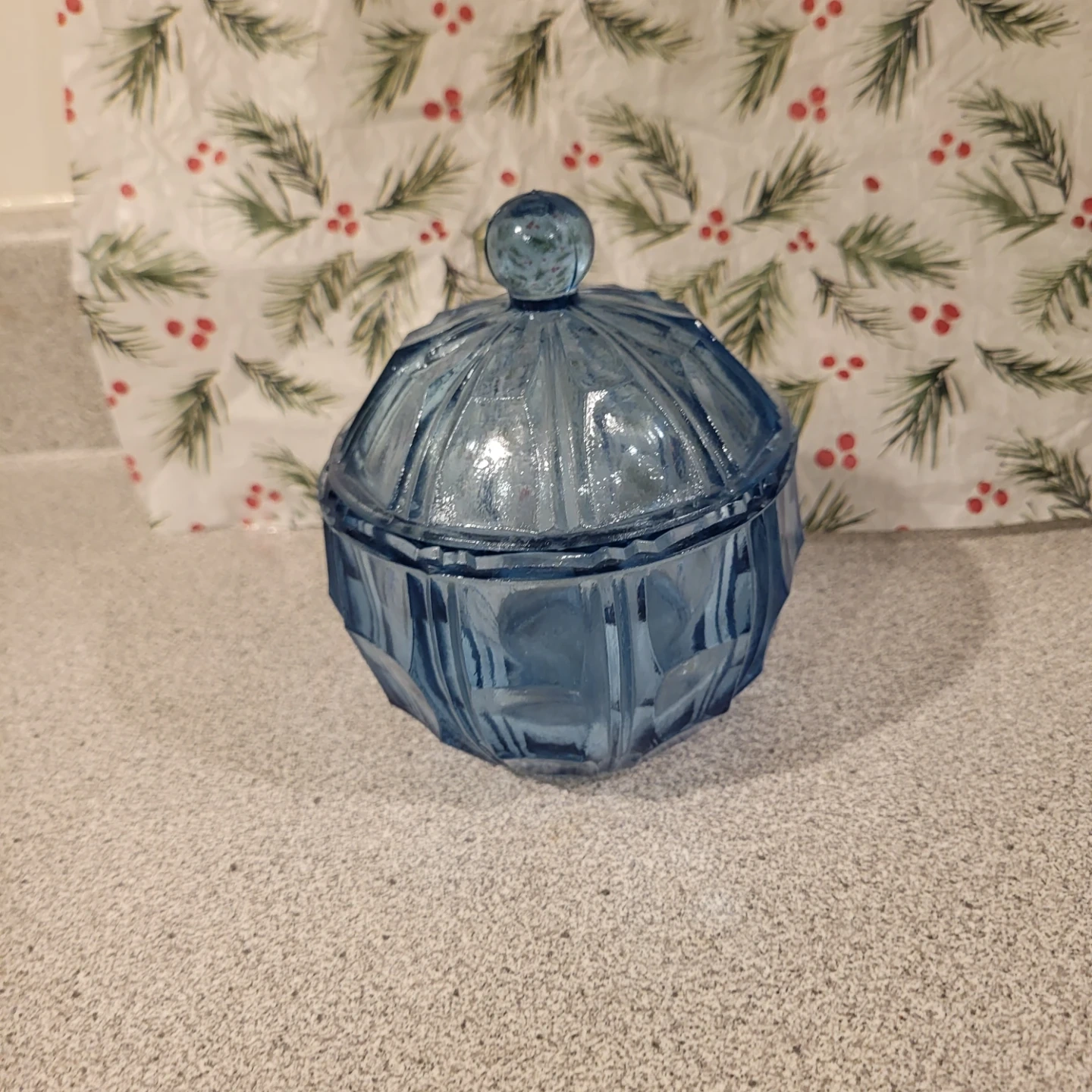 A lovely blue glass candy dish with a matching lid! It's in great shape and ready to hold your favourite treats or trinkets. The intricate design adds a touch of elegance to any space