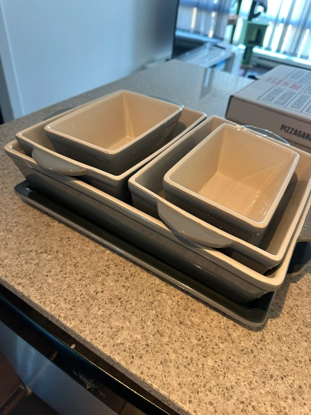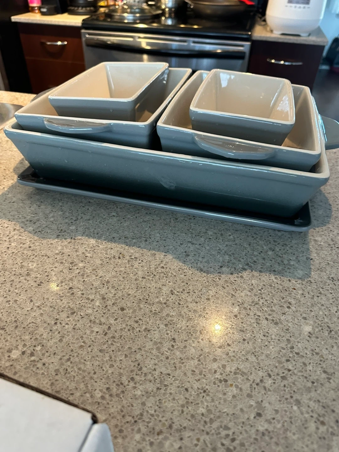 Selling a lovely stoneware set! It includes various baking dishes in a stylish grey colour. Perfect for all your baking needs and in great condition!