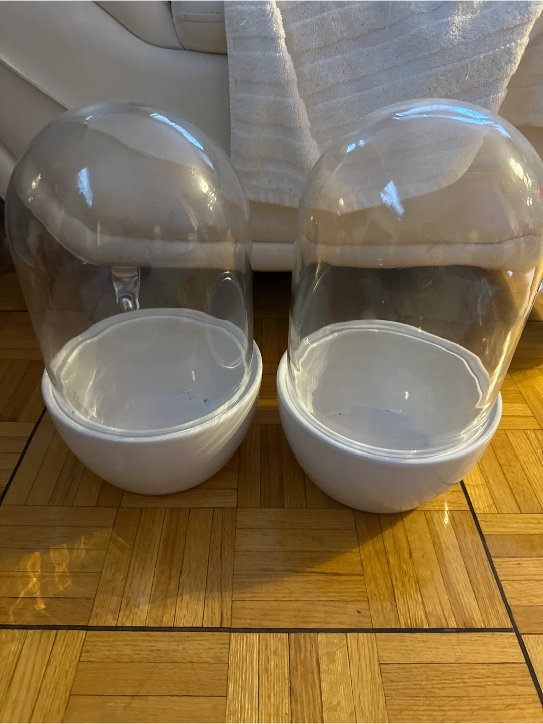 Selling a set of white ceramic cloche dome bell jars. They are in great condition and perfect for displaying your favourite items or plants. The cloches have a clear dome and a white ceramic base. They add a touch of elegance to any room