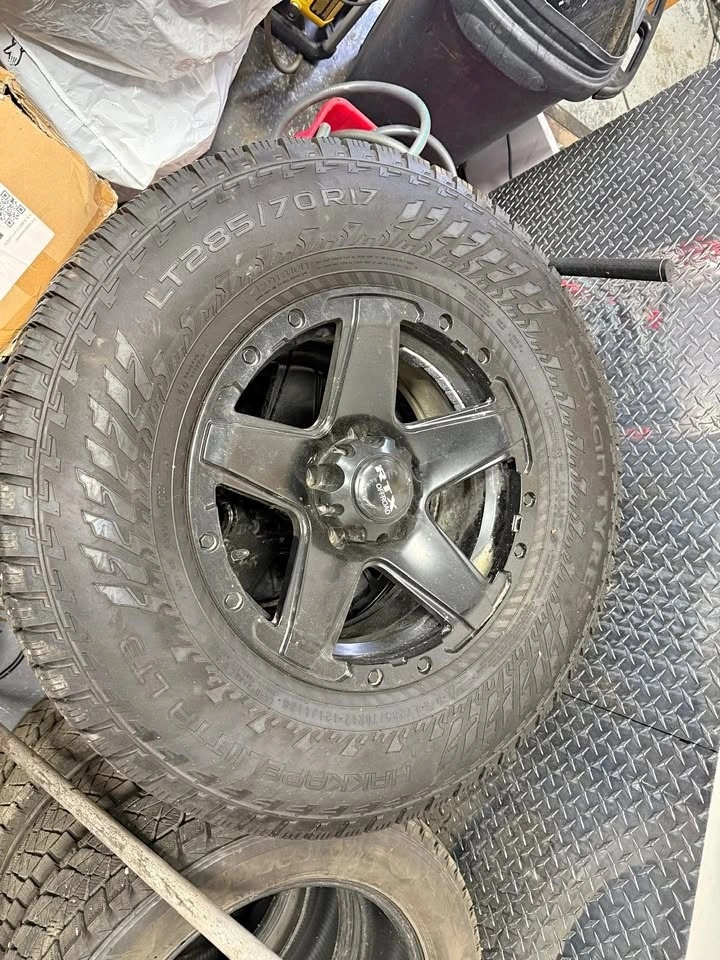 Set of 4 285/70R17 Nokian Studded Winter Tires with Wheels came off Ram 1500. Fourth Generation (2012-2018) models use a 5x139.7mm (5x5.5") pattern. Pick up in Maple Ridge