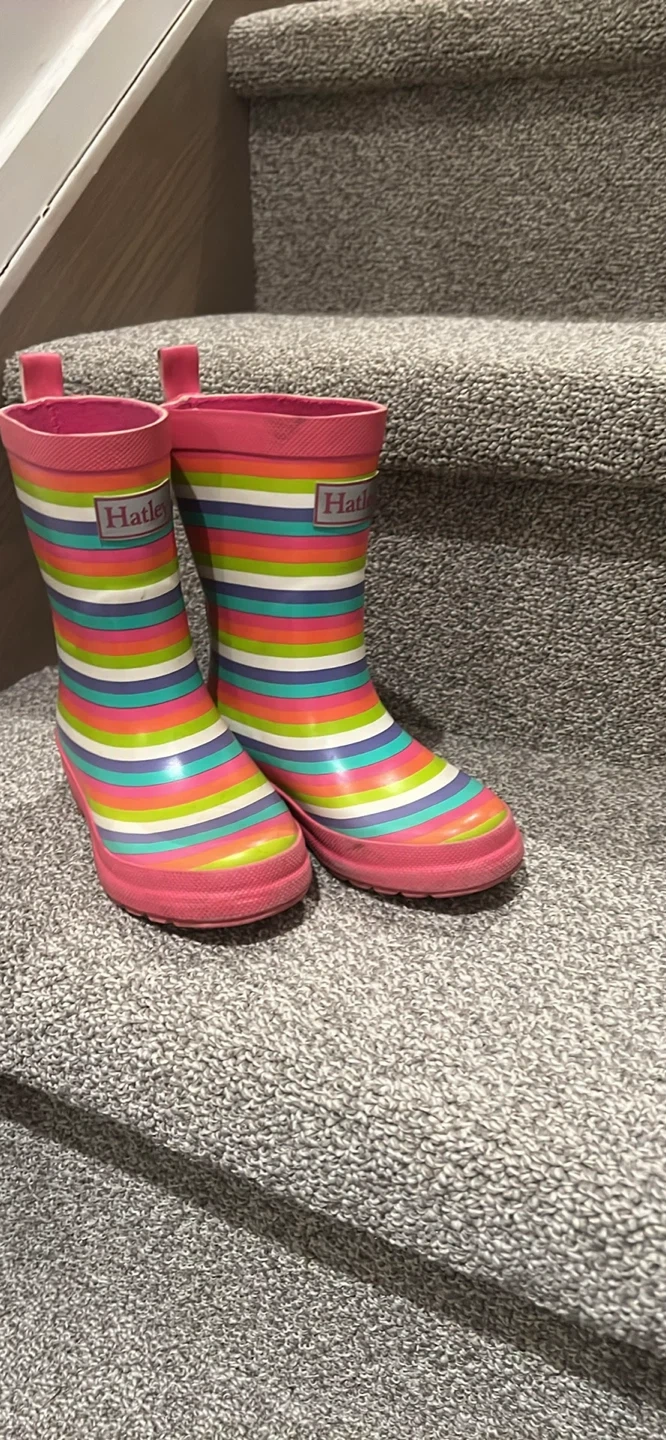These Hatley kids' rain boots are super cute with their colourful striped design! They're in great condition and ready for some puddle-jumping fun. Size is 9 toddler.