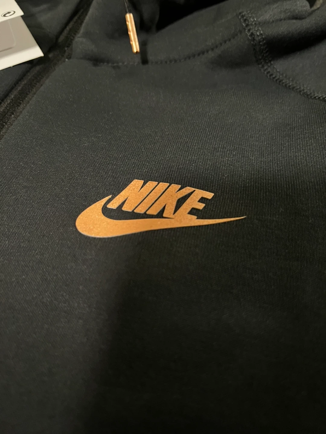 Selling a Nike Tech Fleece suit in black with gold accents. The set includes both the hoodie and the pants. It's in great condition and ready for a new owner!