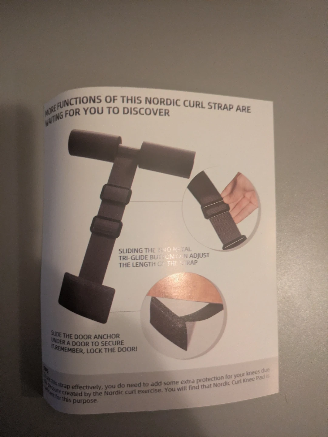 Get ready for versatile workouts with this Nordic curl strap! It's great for hamstring curls, sit-ups, Spanish squats, razor curls, Russian twists, and more. This strap also features a sliding two-metal tri-glide button so you can adjust the length of the strap. It also includes a door anchor to secure it; remember, lock the door!