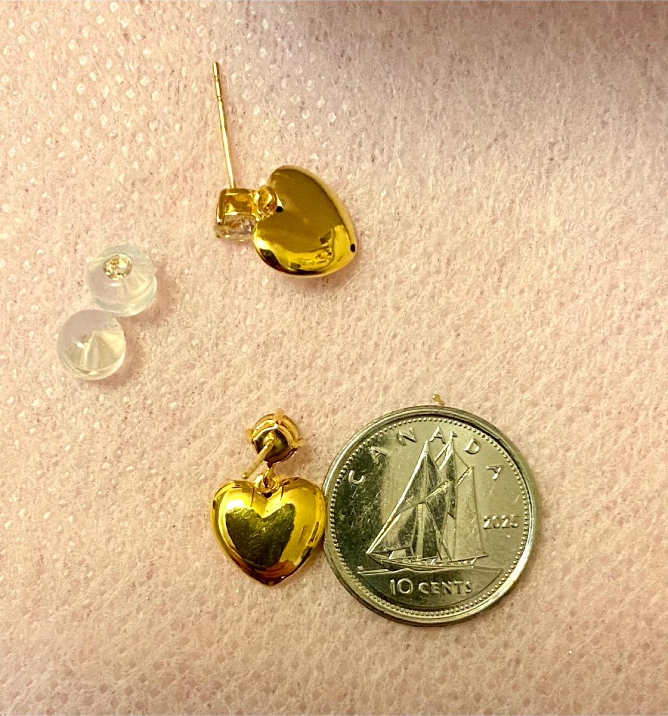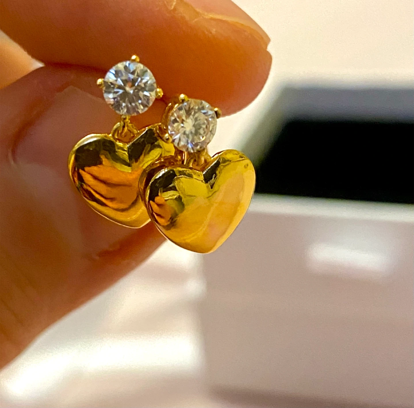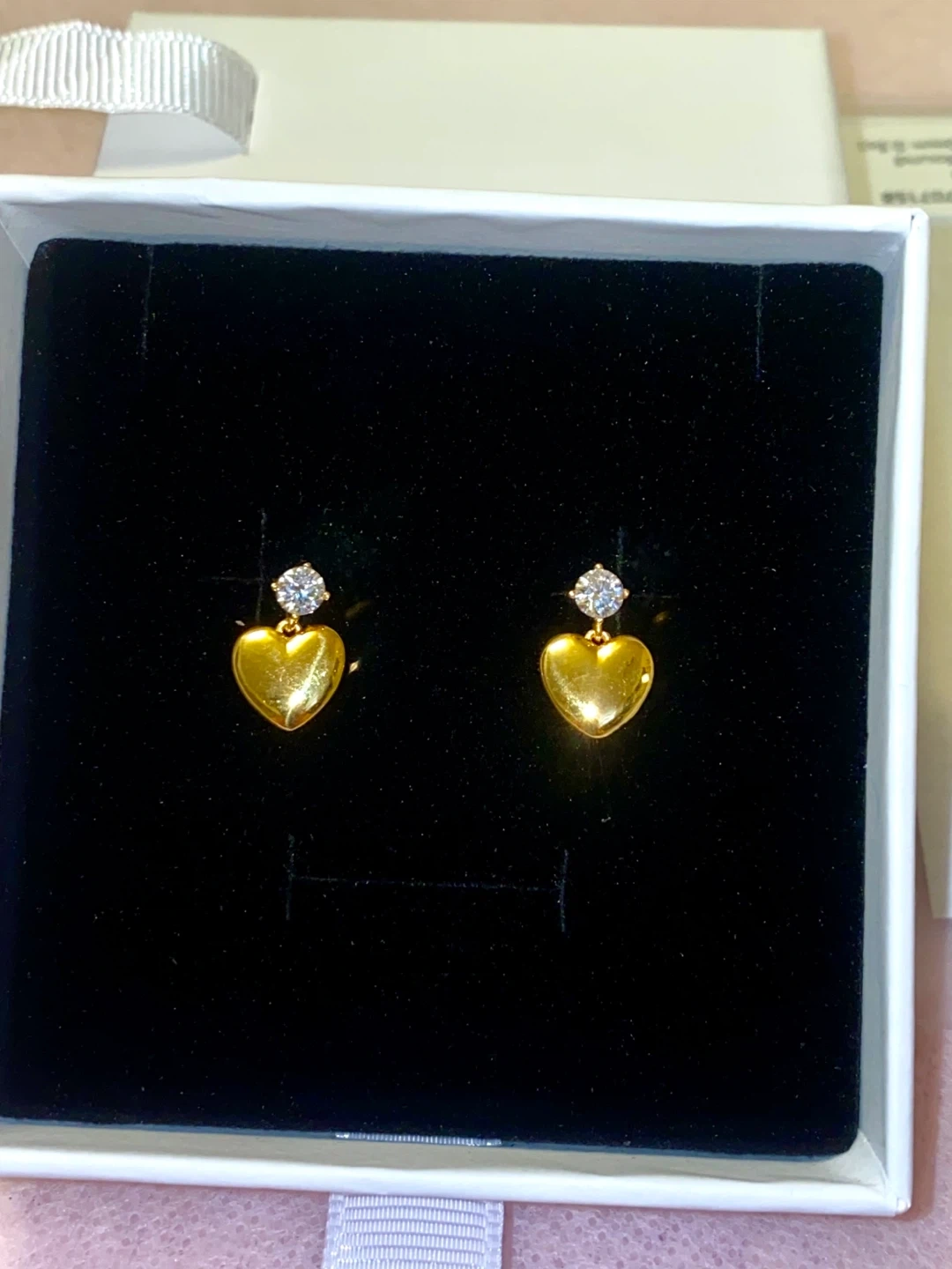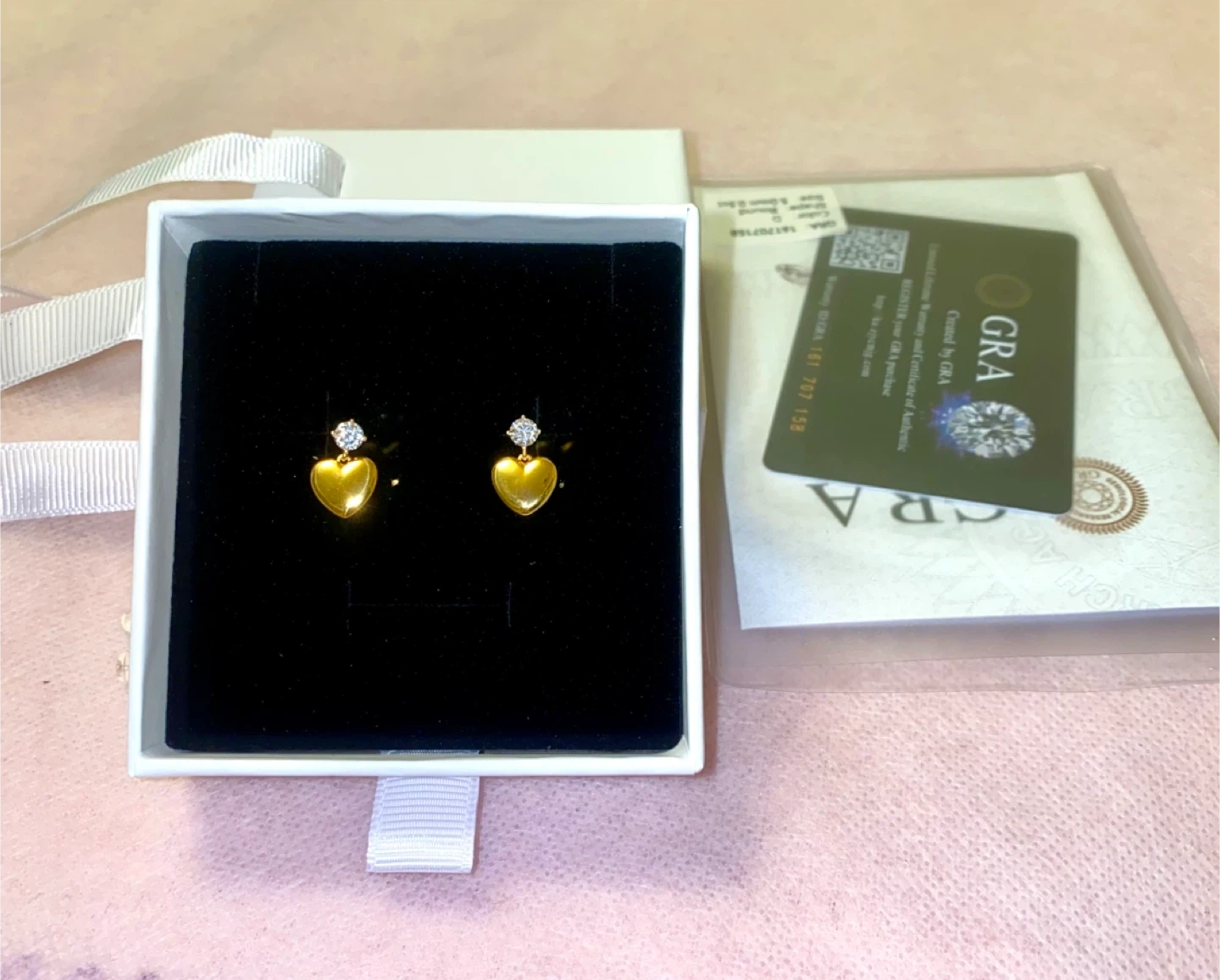 Selling a pair of brand new GRA gold heart earrings, each featuring a small diamond accent! They come in their original box, perfect as a gift or a treat for yourself
