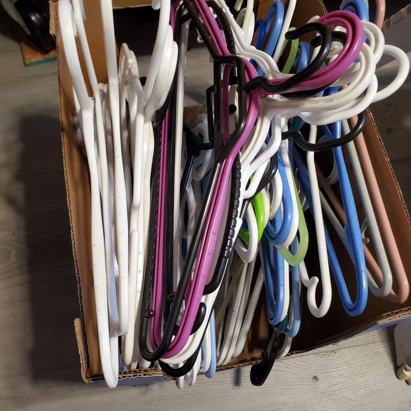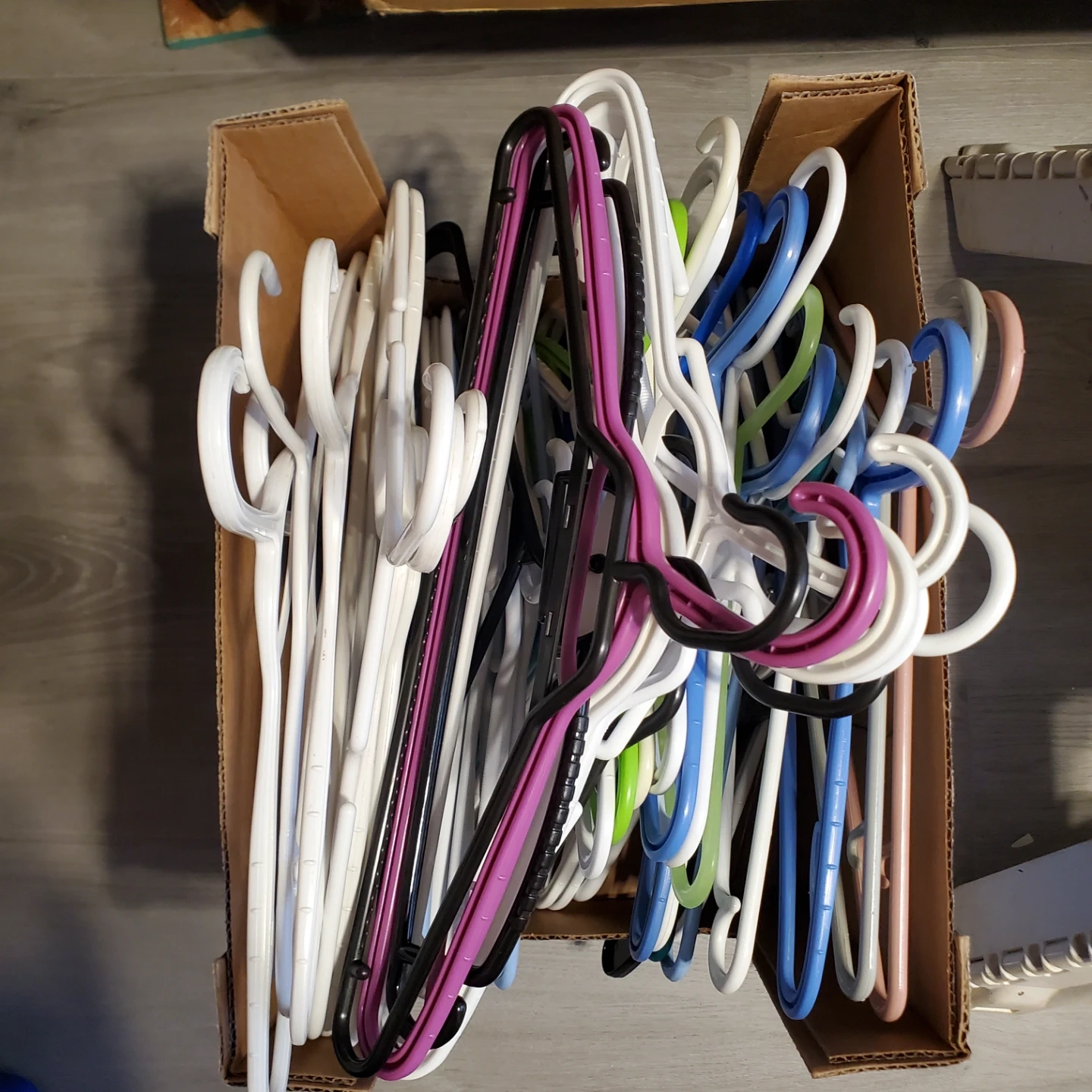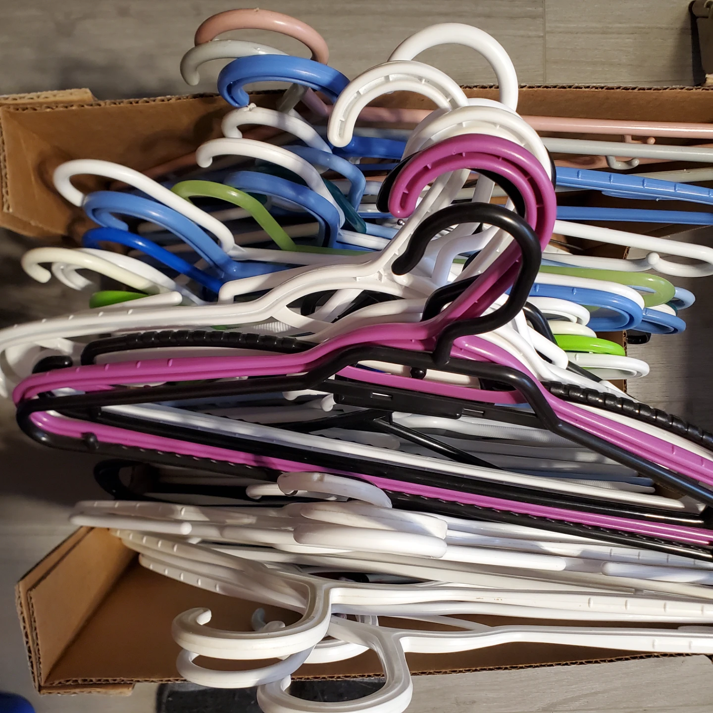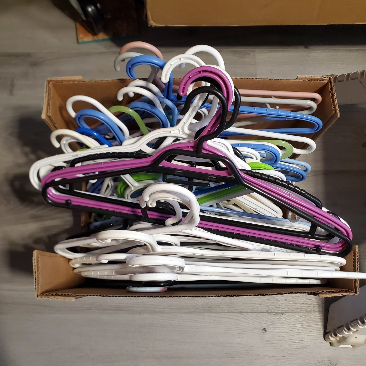 Giving away box of mixed colour clothes hangers. There are many different colours, including white, pink, blue, green, and black. Perfect for organizing your closet!