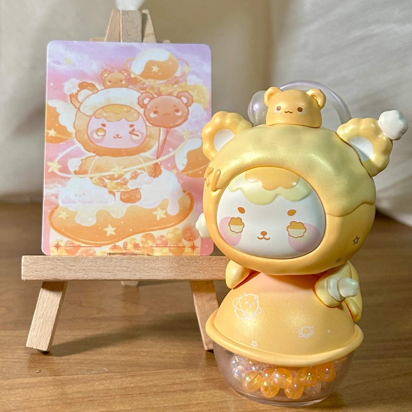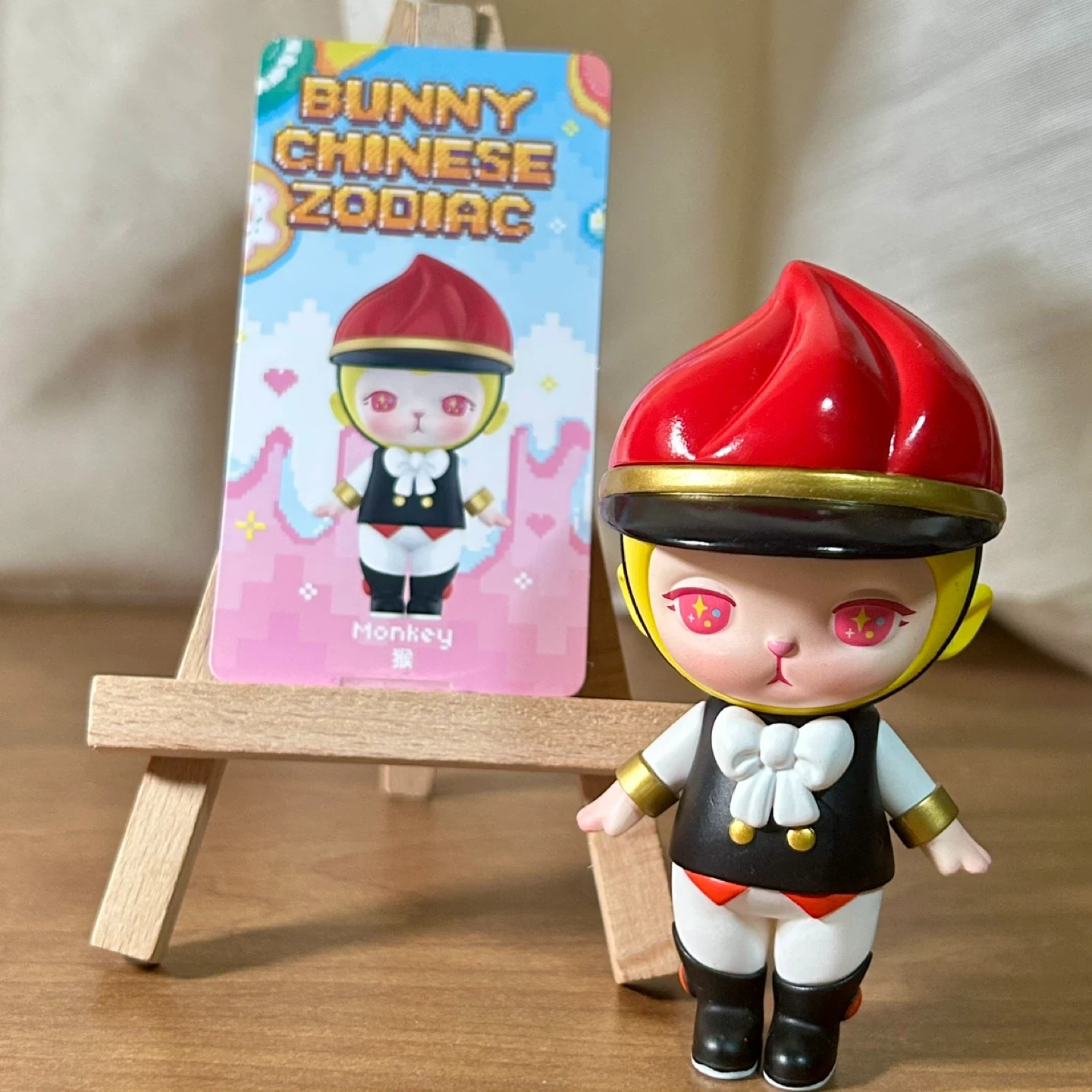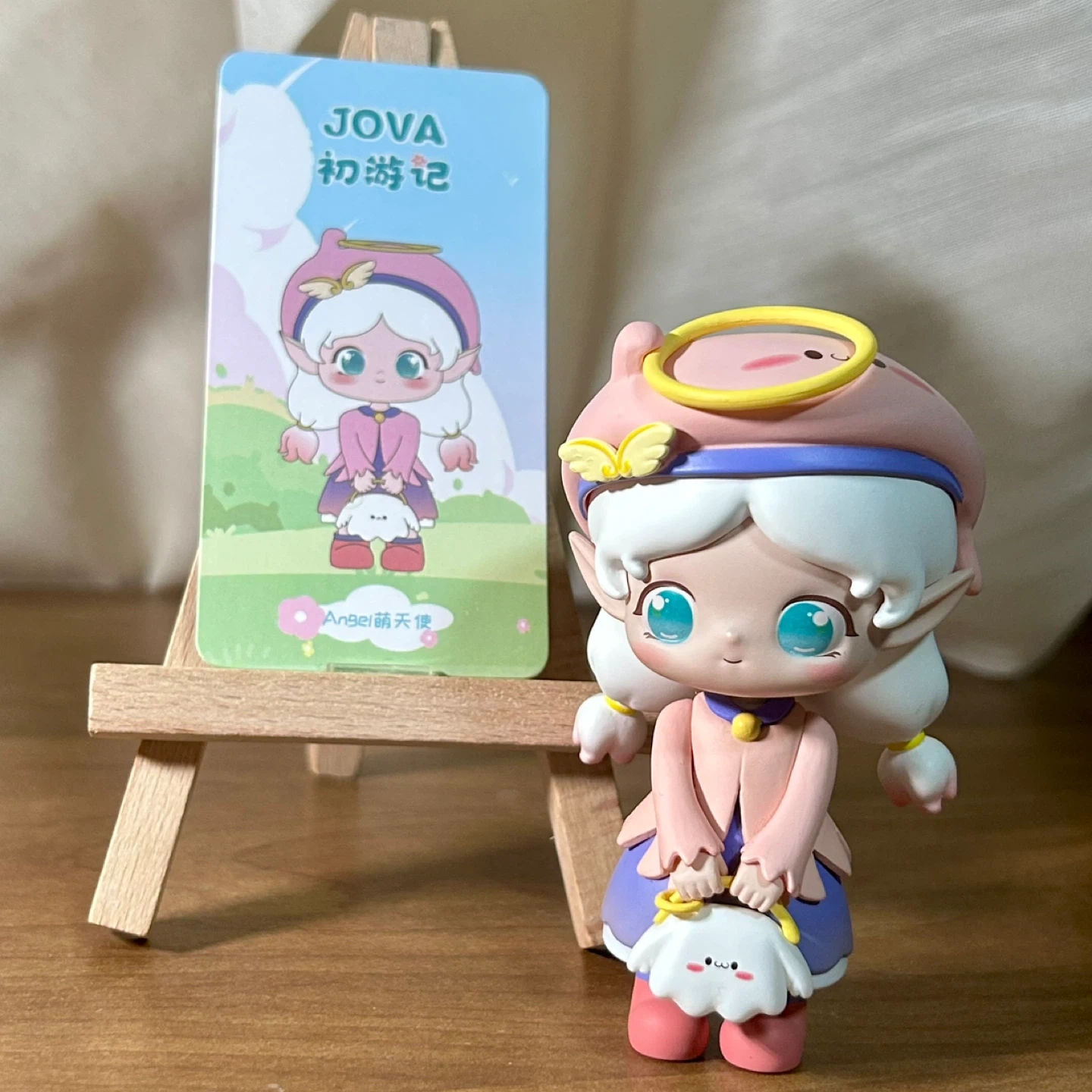 Mix of blind box character figurines including Ennui, Saturn Bear from Lucky Mix, Monkey from Popmart x Bunny, and Angel from Jova. Comes with character cards.