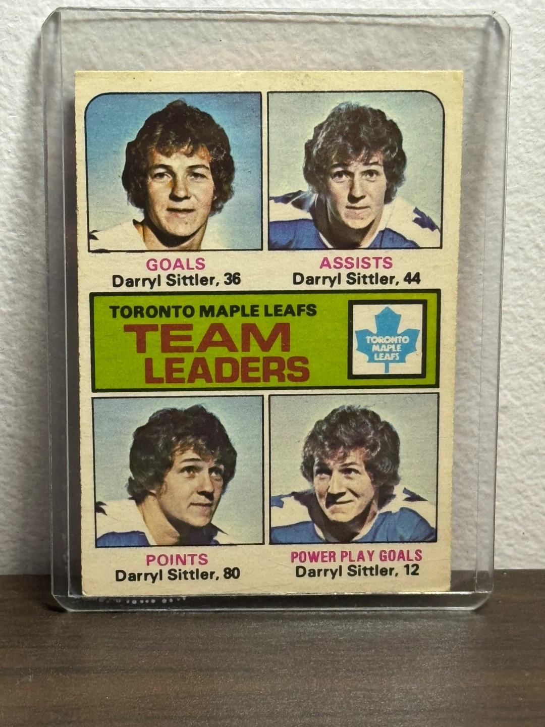 Selling a vintage Toronto Maple Leafs team leaders card featuring Darryl Sittler. The card highlights Sittler's stats in goals, assists, points, and power play goals. A great collectible for any Leafs fan!