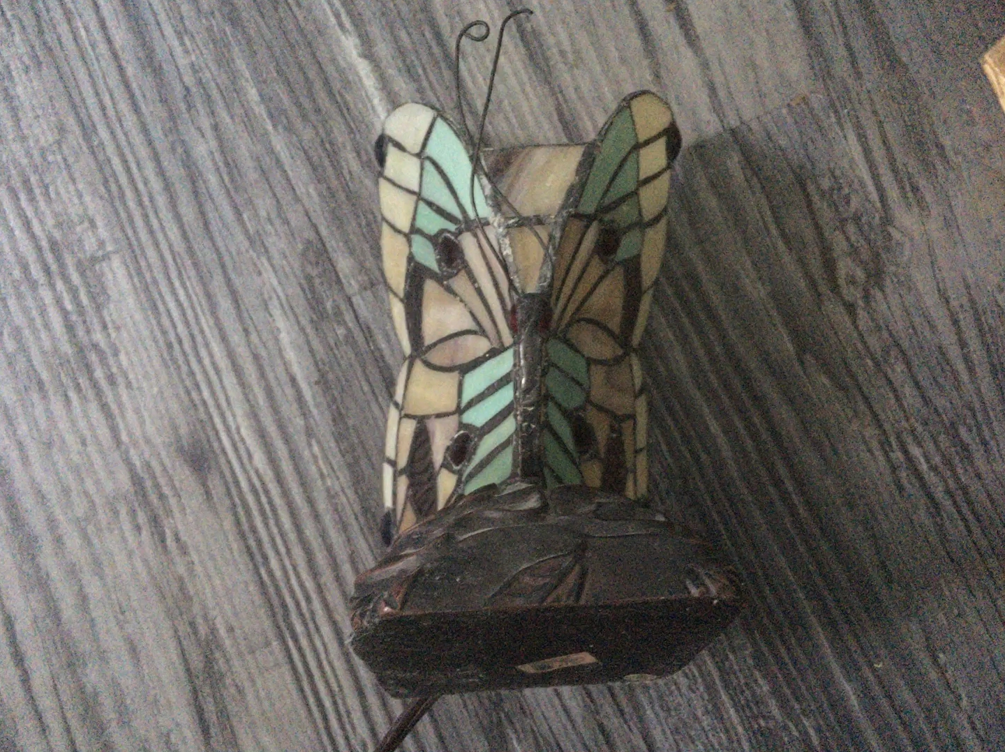 Selling a cute butterfly-shaped accent lamp! It features stained glass wings in shades of green, yellow, and brown. The base has a floral design. This little lamp would add a touch of whimsy to any room