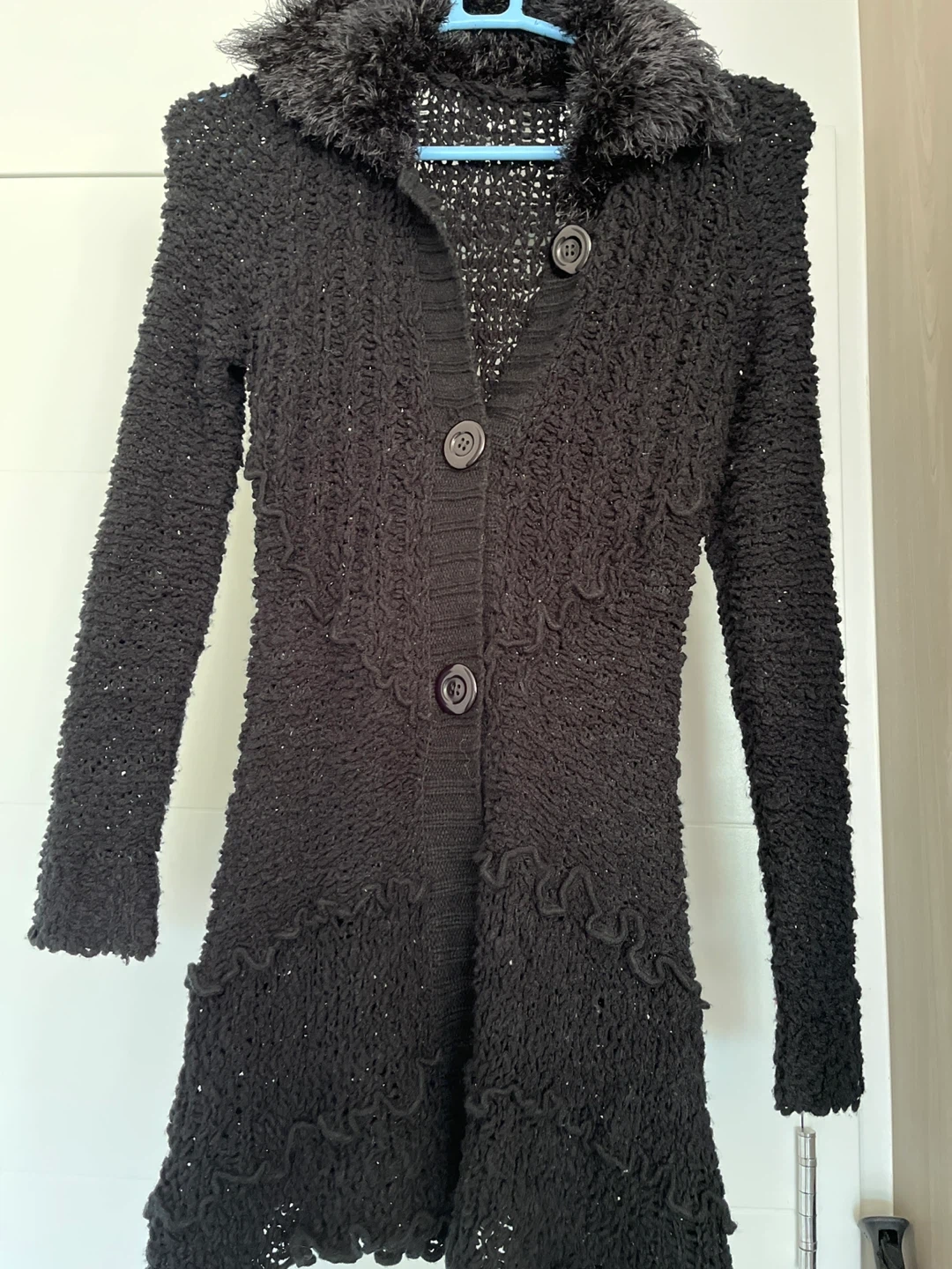 Selling a cozy black knit cardigan. It features a unique textured knit pattern and a stylish fur collar. Perfect for adding a touch of warmth and sophistication to your wardrobe!