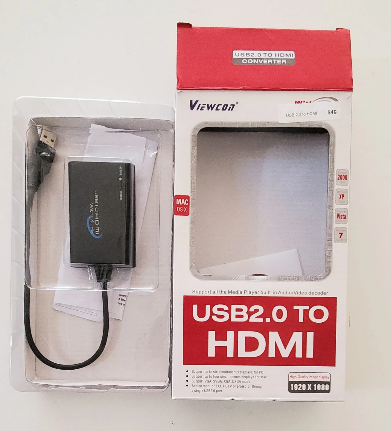 Selling a Viewcon USB2.0 to HDMI converter. It supports up to six simultaneous displays for PC and up to four simultaneous displays for Mac. It also supports VGA, SVGA, XGA, UXGA mode. Add a monitor, LCD HDTV, or projector through a single USB2.0 port. Originally priced at $49