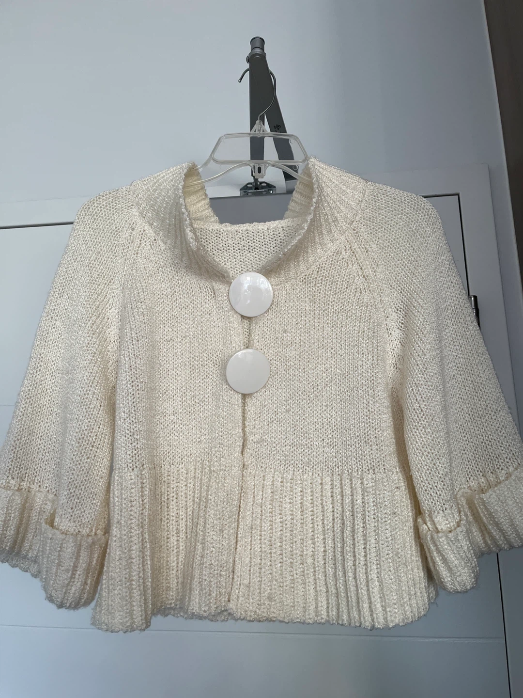 A lovely cream knit bolero shrug, perfect for layering! It's in great condition and features a unique knit pattern and large button closures. A great addition to any wardrobe!