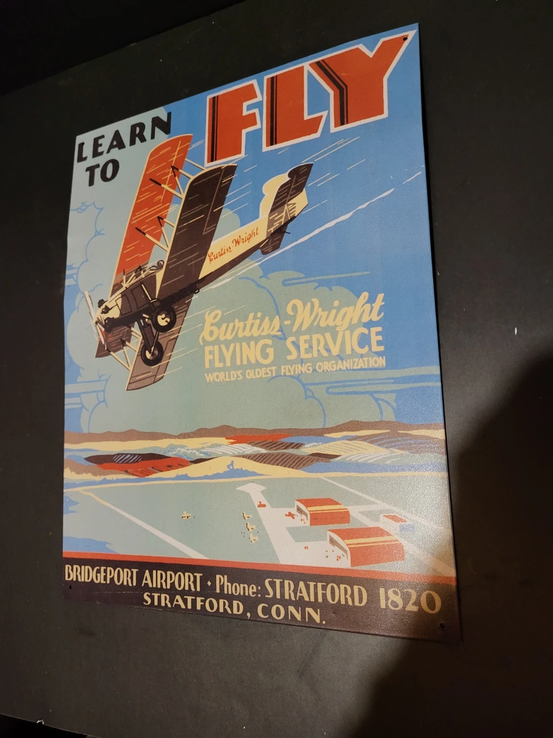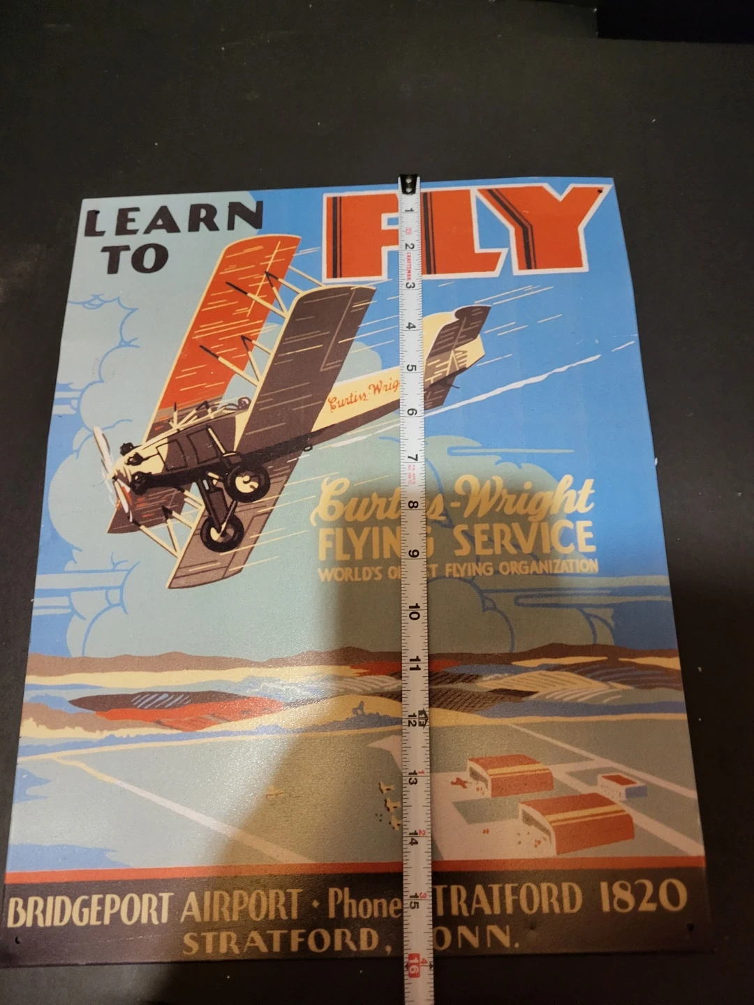 Selling a Curtiss Wright Flying Service metal sign! It features a vintage airplane design with the words "Learn to Fly" at the top. The sign also showcases Bridgeport Airport and the phone number for Stratford 1820. The dimensions are approximately 12 inches by 16 inches.