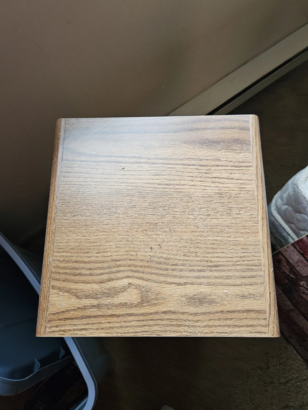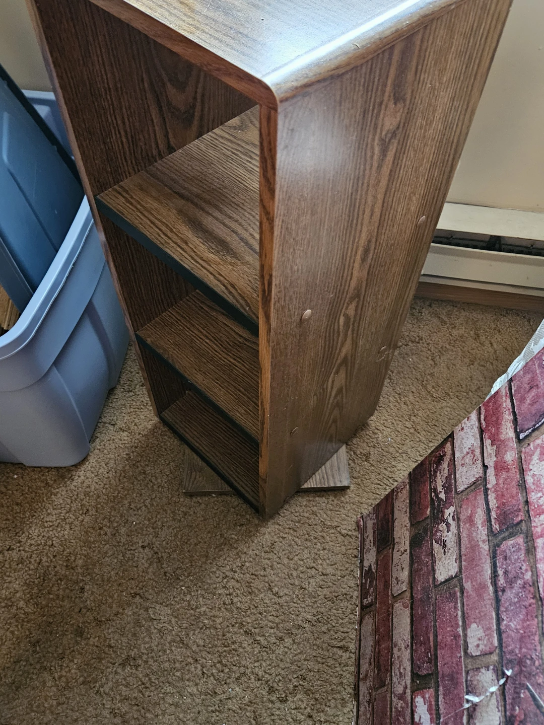 Here's a wooden shelf unit, perfect for displaying items or storing books. It has three shelves and a sturdy design. It's in good condition and ready for a new home!