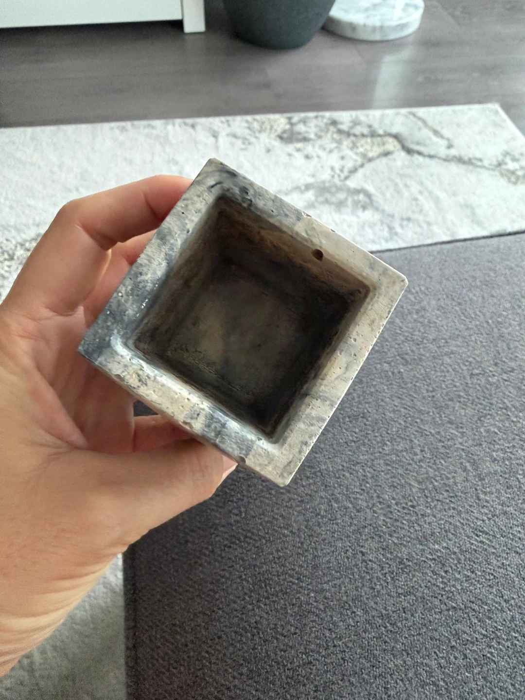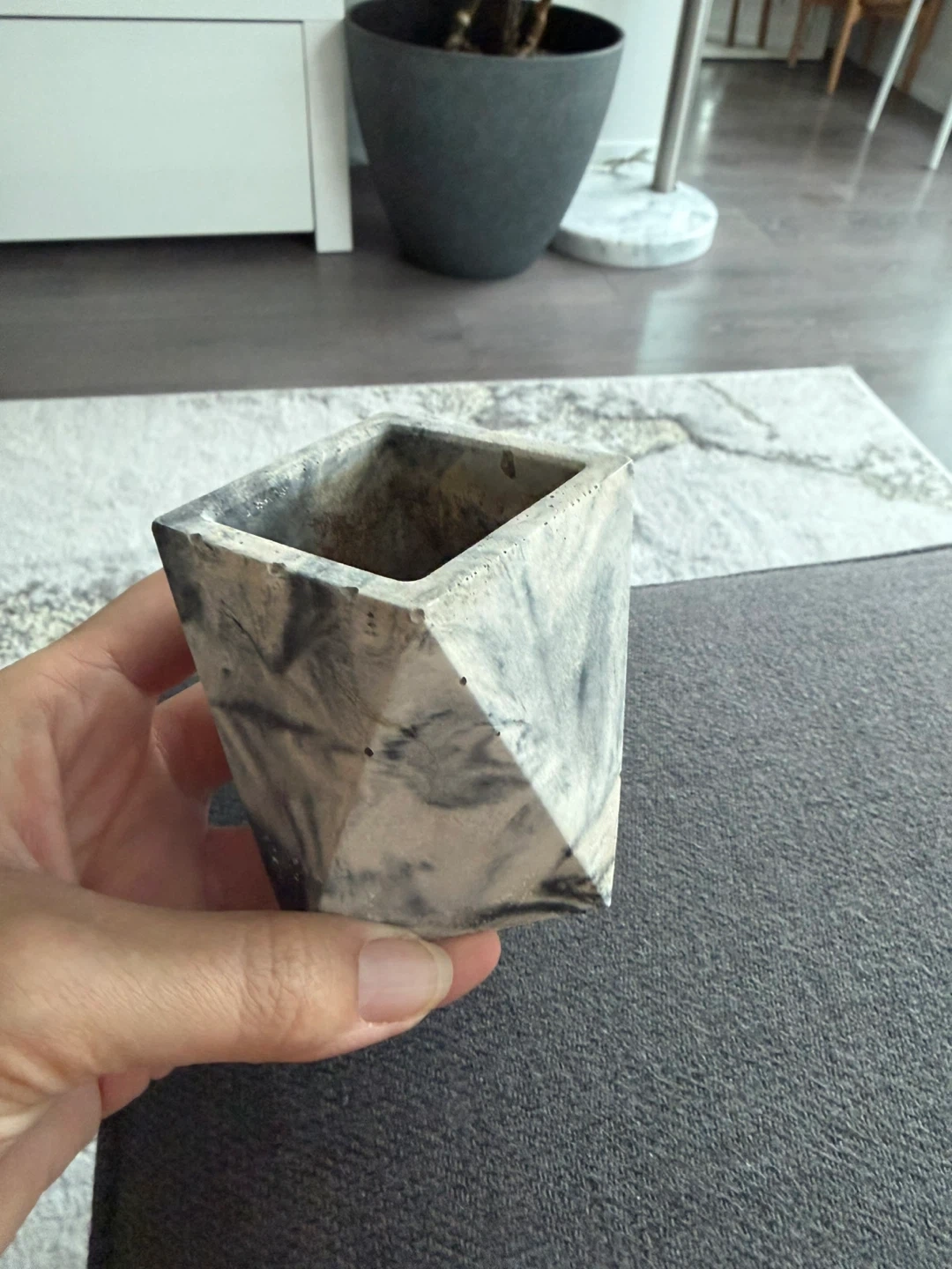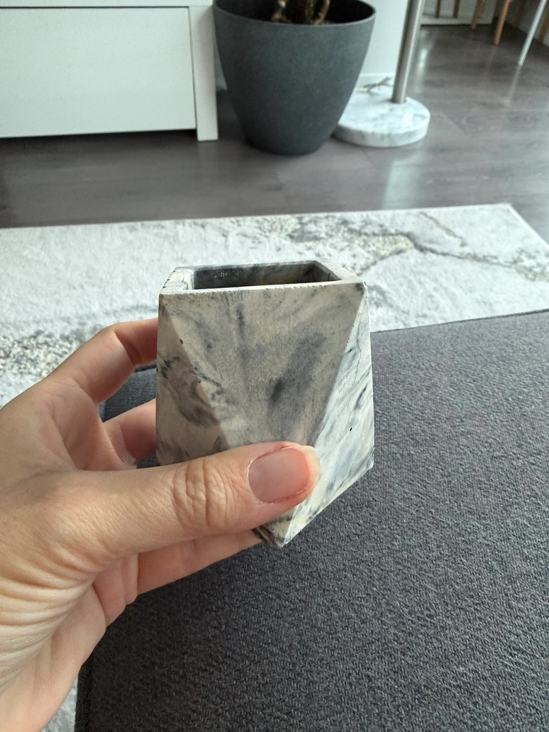 Selling a cute little concrete planter! It's perfect for small succulents or cacti. The planter has a unique marbled grey and white finish that would look great in any room of the house