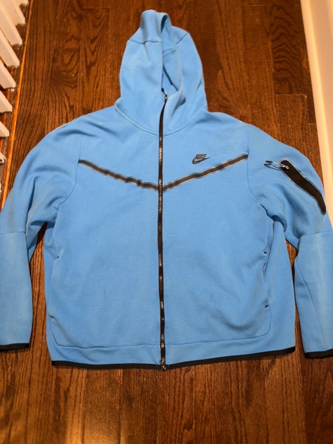 Selling a Nike Tech Fleece full-zip hoodie in a nice shade of blue! It features a sleek design with black accents and the Nike logo on the chest. Perfect for staying comfortable and stylish.