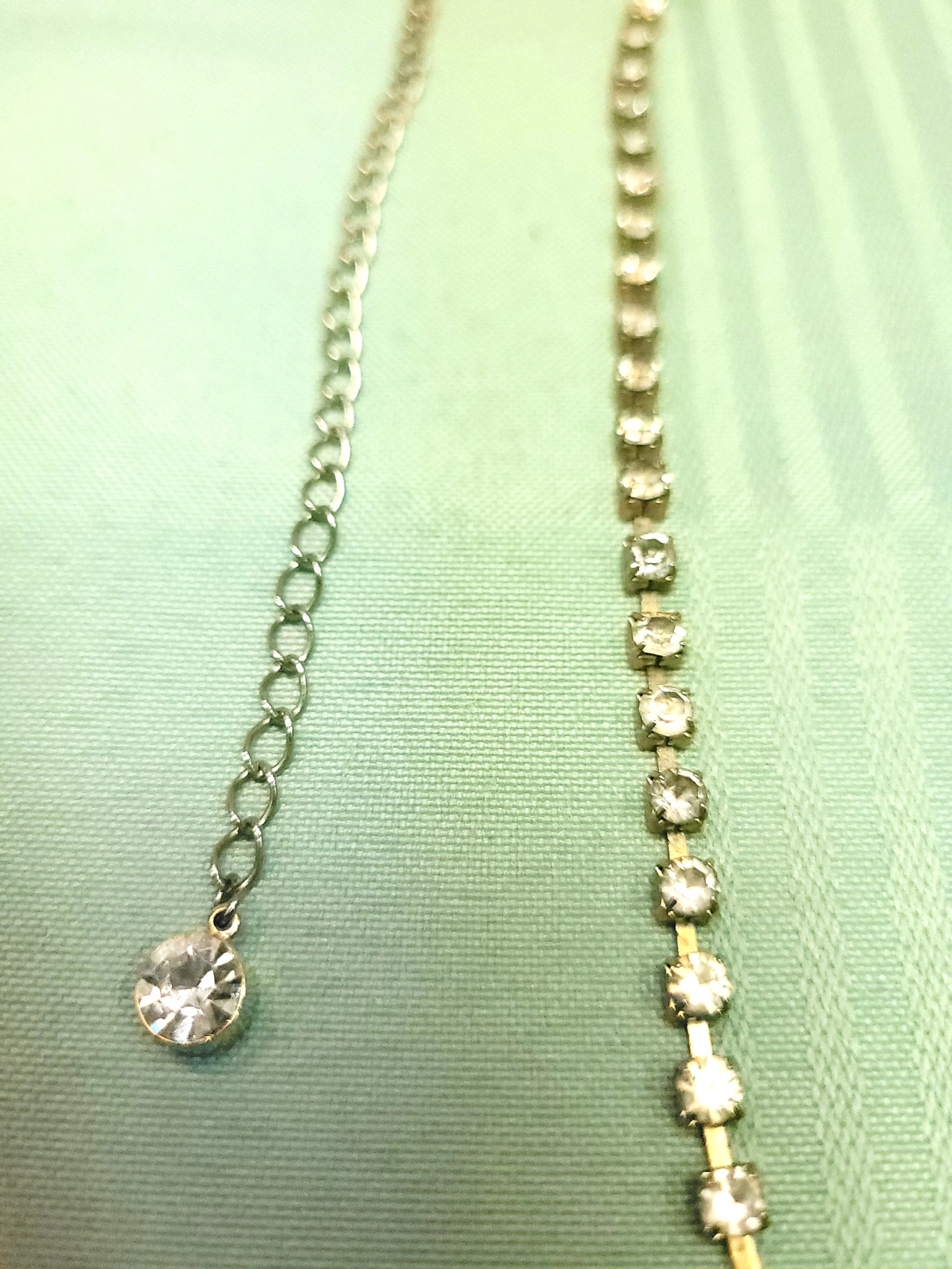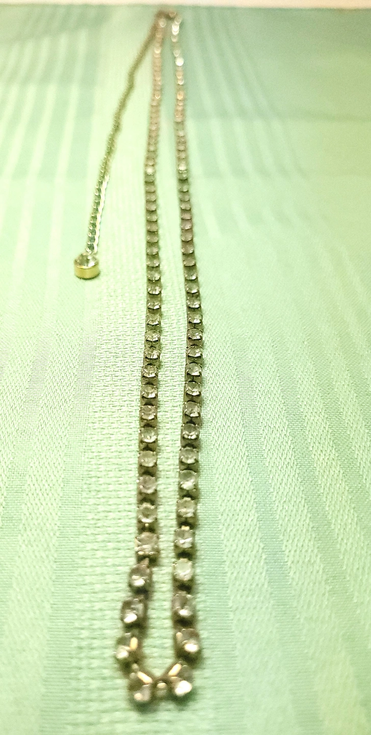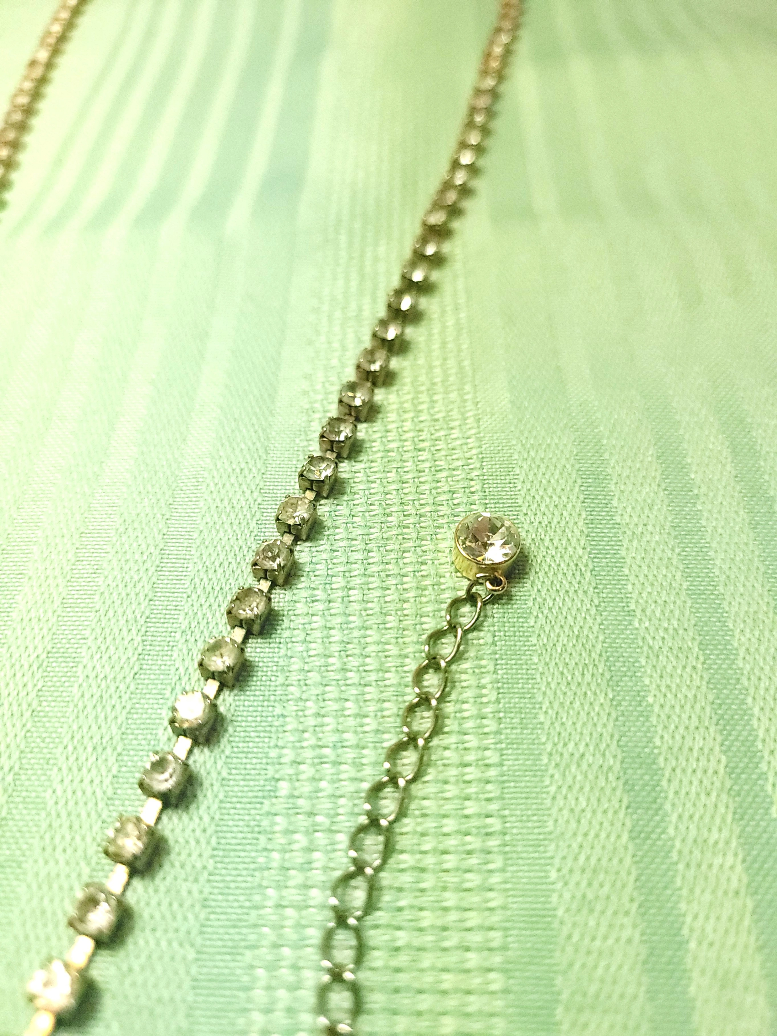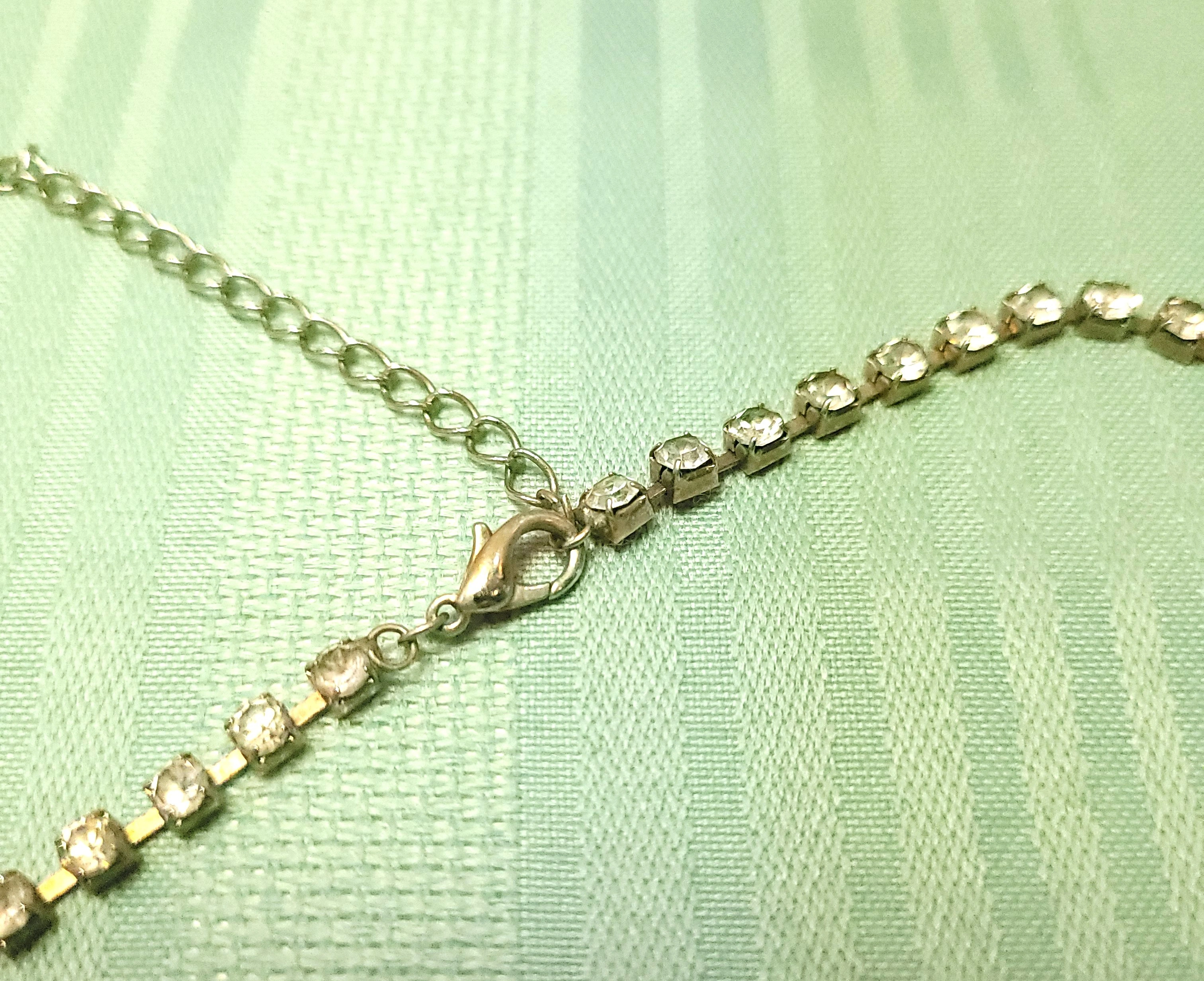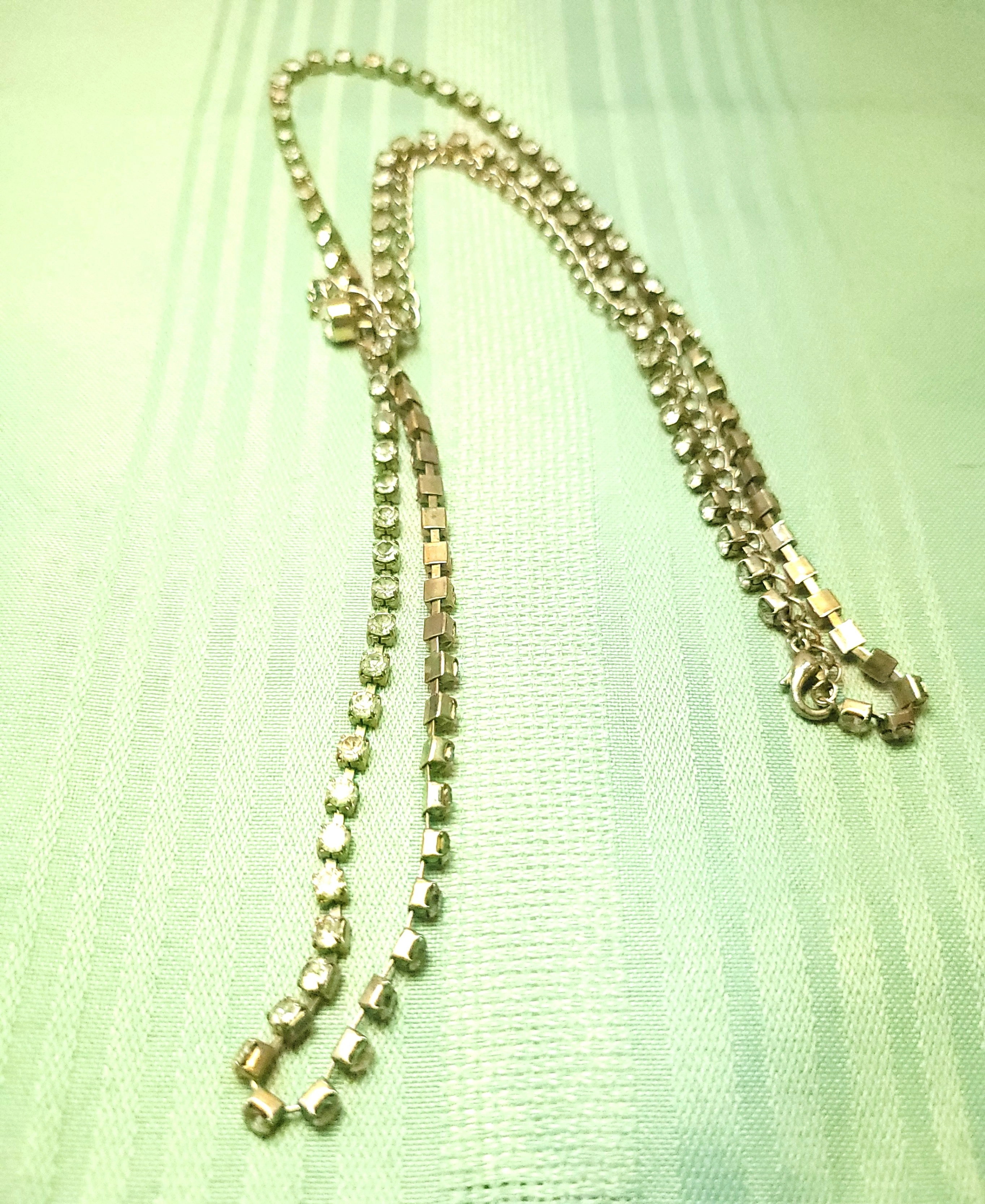 The piece features high-clarity clear rhinestones individually set in silver-tone square cups, providing a fluid drape that catches the light beautifully. The adjustable extender chain is finished with a decorative rhinestone "drop" for a polished look.
