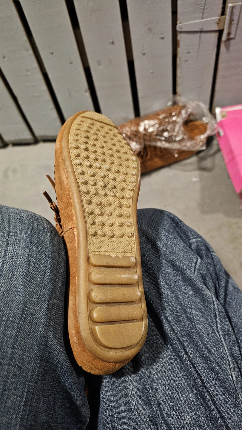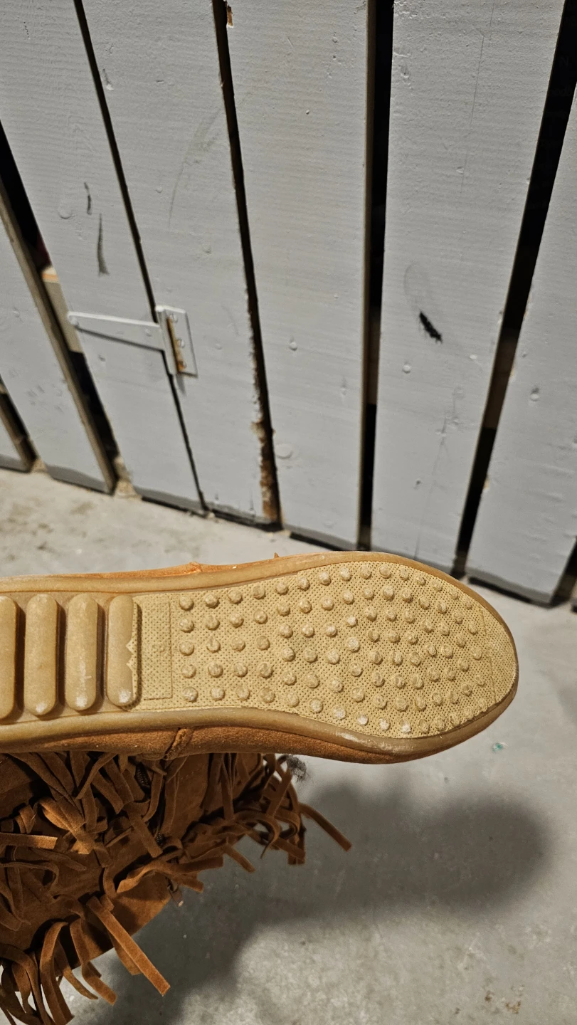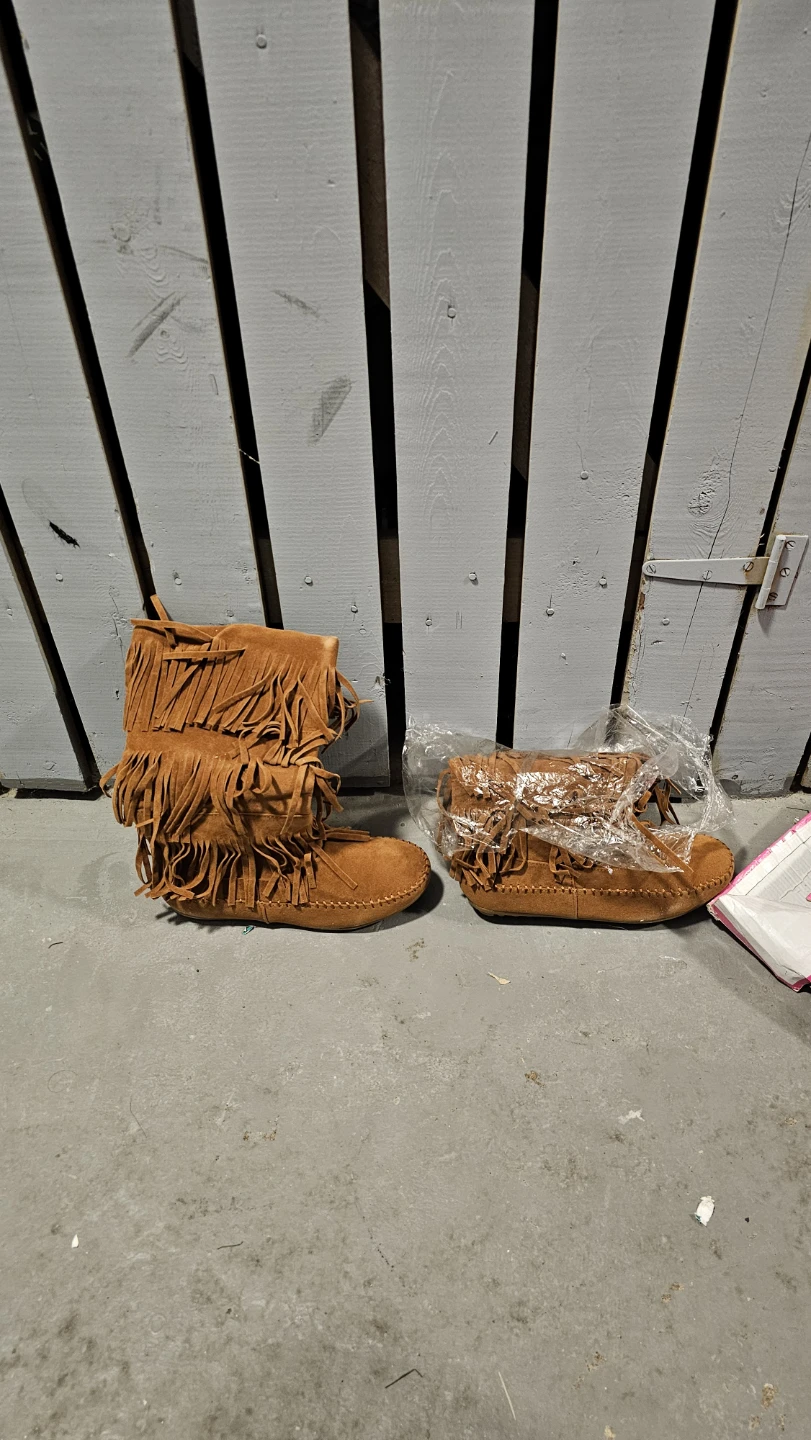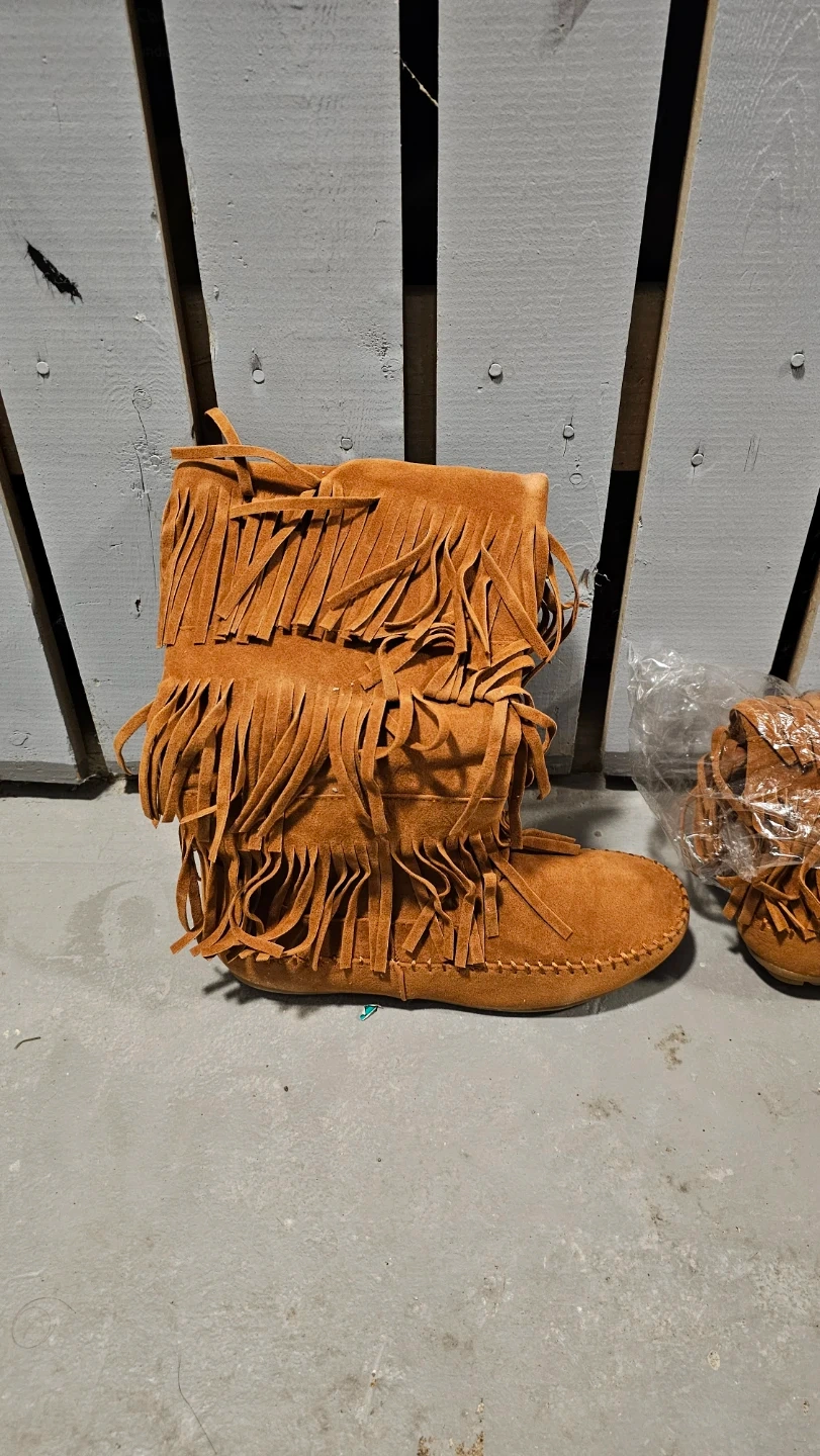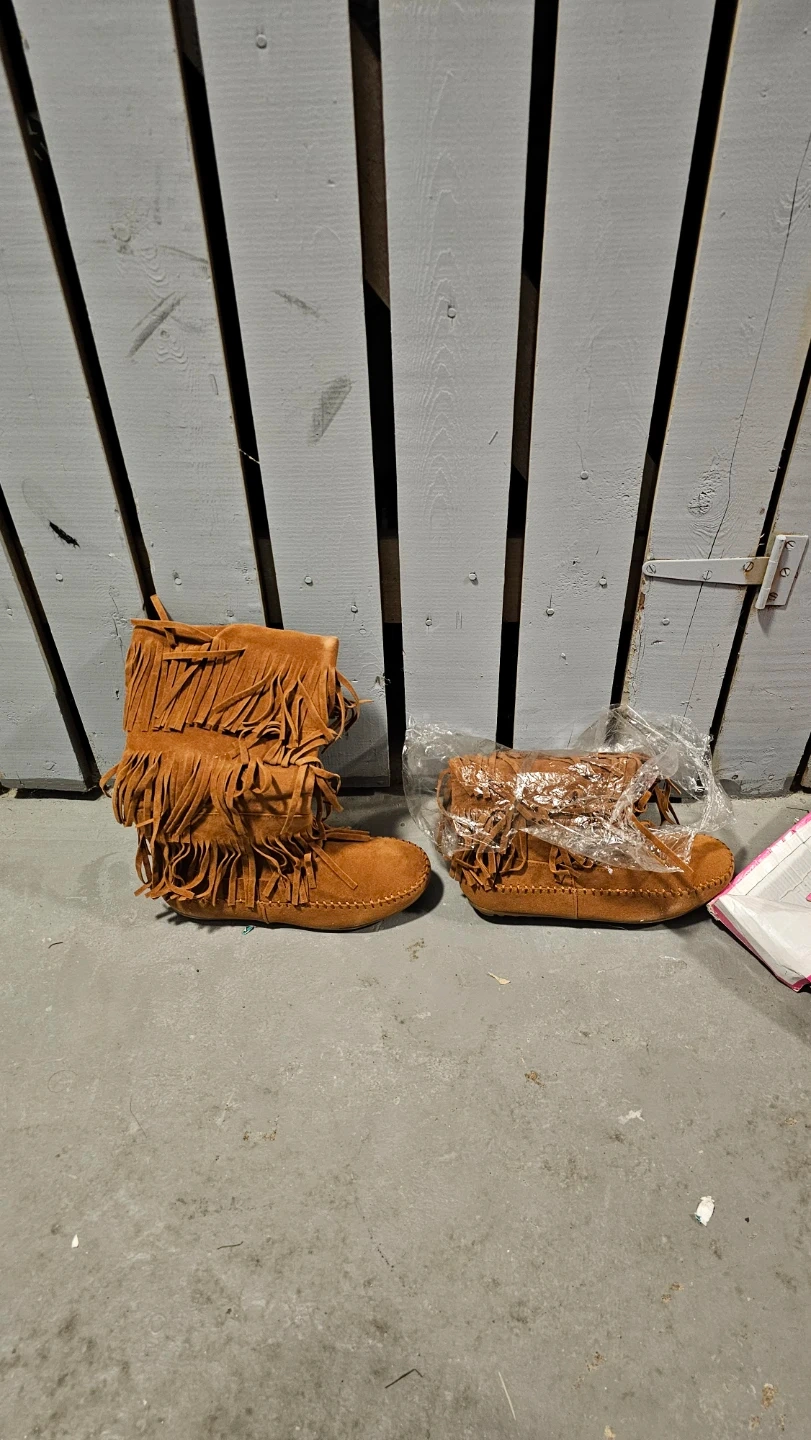 Selling a brand new, in box, pair of tan fringe moccasin boots in size 8. Made by Shoes of Soul.