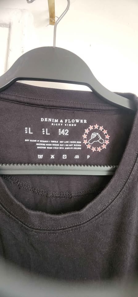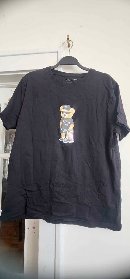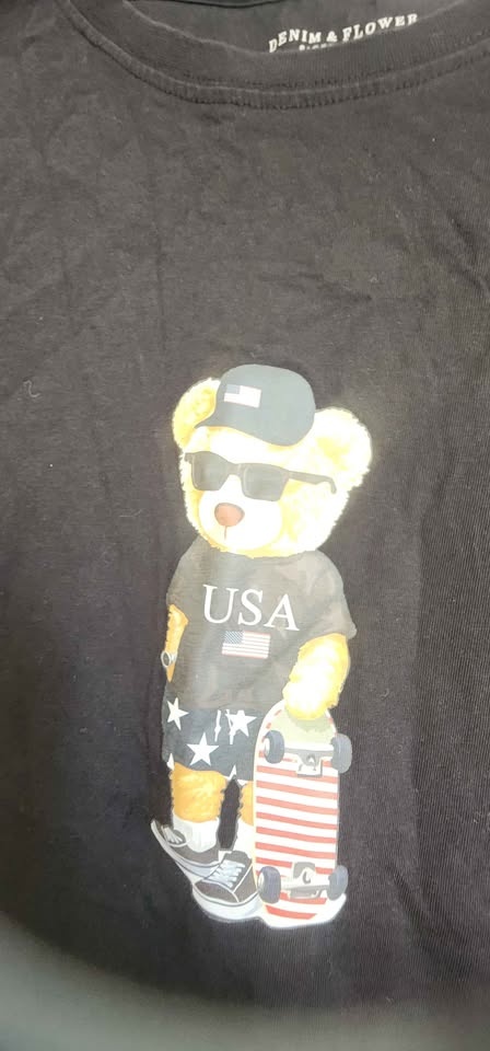 Denim & Flower brand shirt featuring their patriotic USA bear graphic. The bear graphic is a signature design by the brand's designer, Ricky Singh.