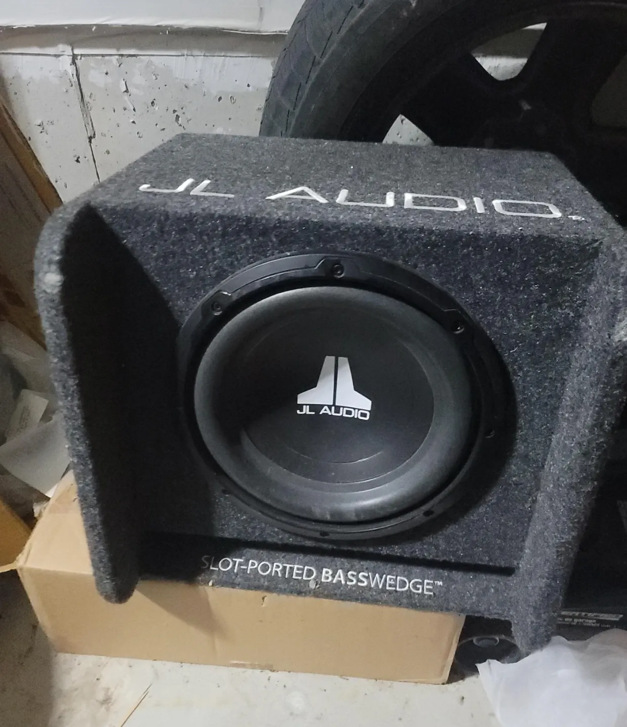 This is a JL Audio subwoofer in a slot-ported basswedge enclosure. It's designed for car audio systems. Comes in a textured grey finish.