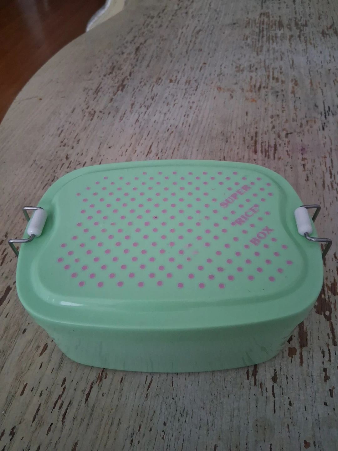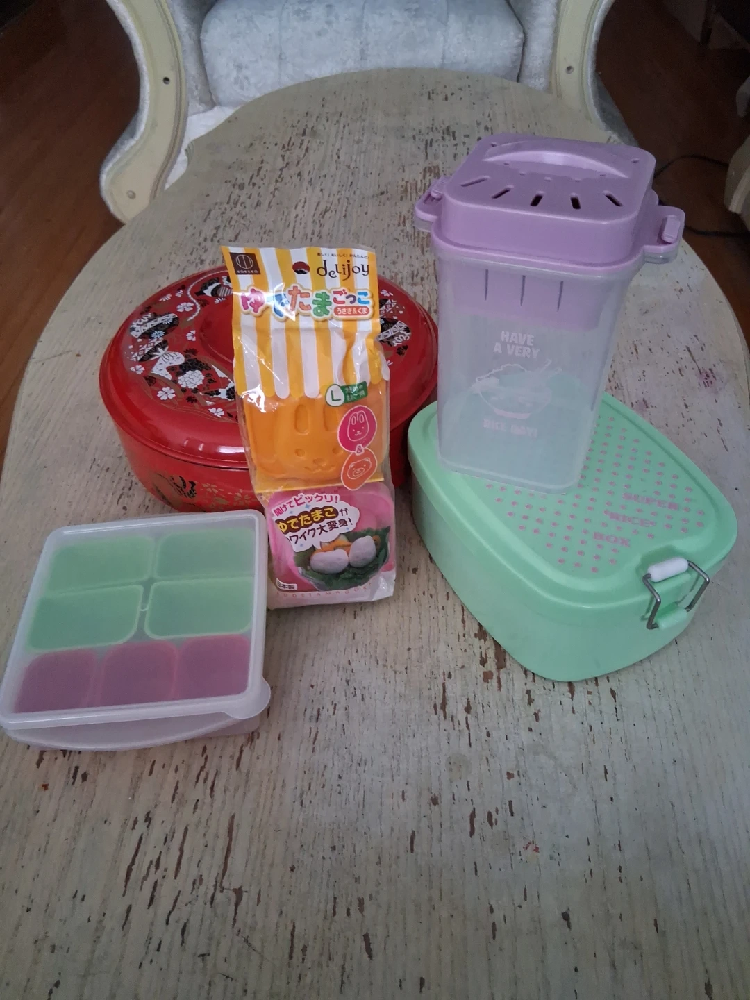 cCollection of assorted food storage containers. Includes a red round tin, a green rice box, a purple container, and a small ice cube tray. Great for parties, packing lunches, and storage. 🙌 $15 for the Bundle!