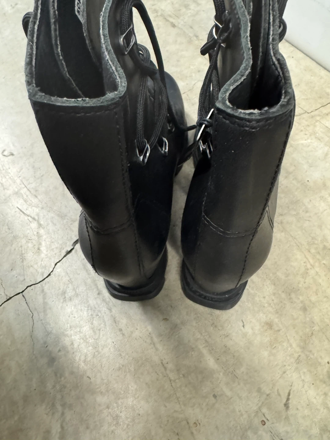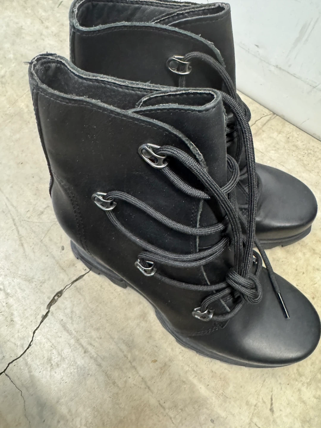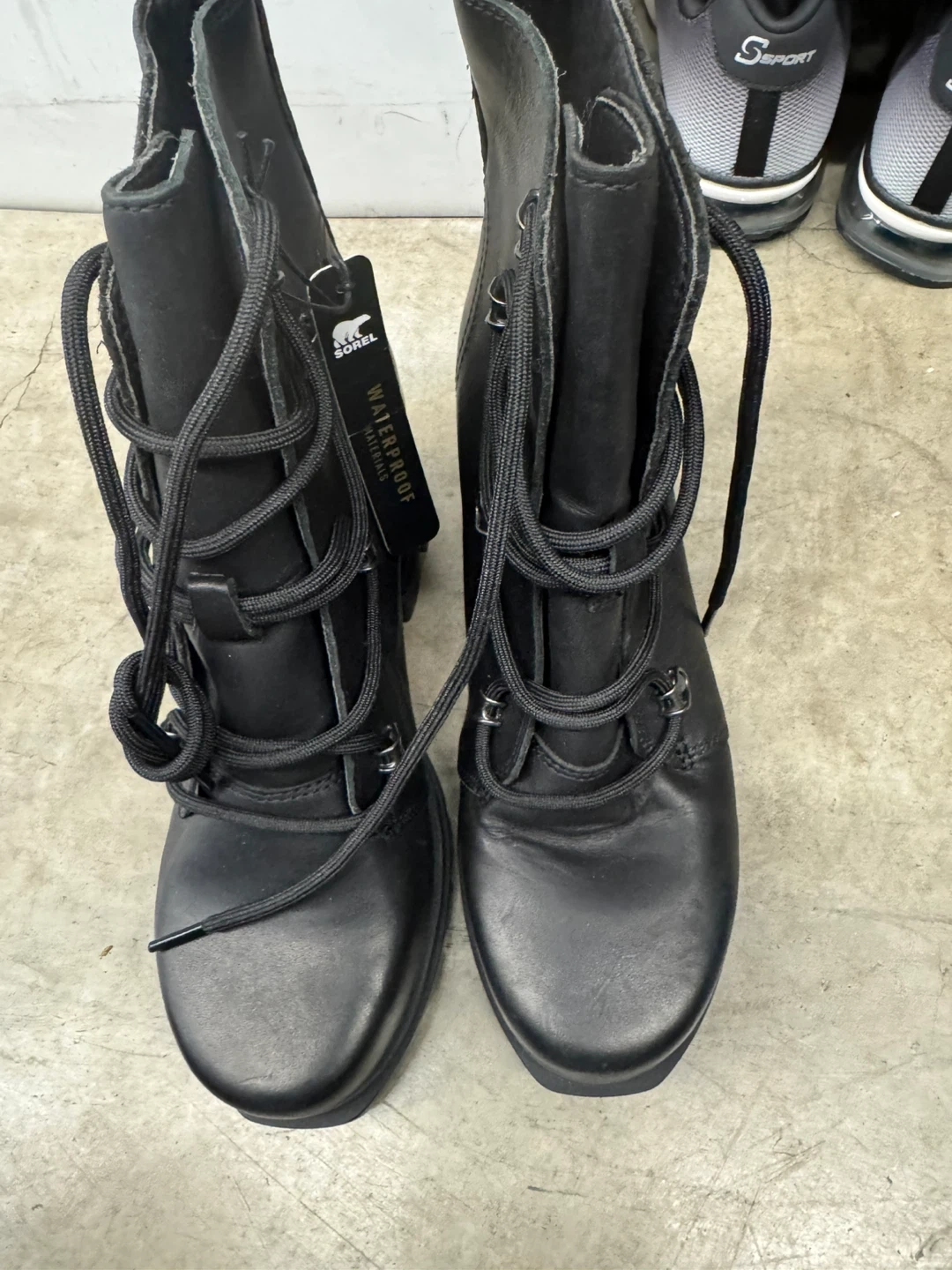 These are a pair of Sorel waterproof ankle boots in black leather. They feature a lace-up design and are in great condition! Perfect for fall or winter weather