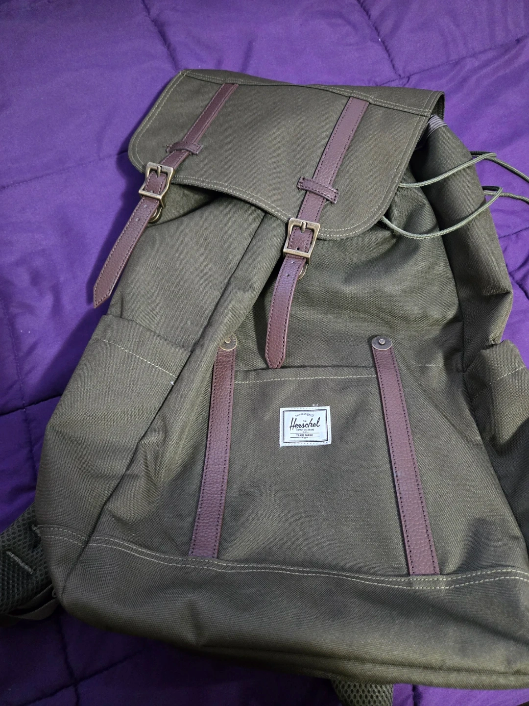 This Herschel Supply Co. backpack is in great condition and ready for a new adventure! It features a stylish olive green colour with brown accents. Perfect for school, work, or travel! This backpack can be used for men and women