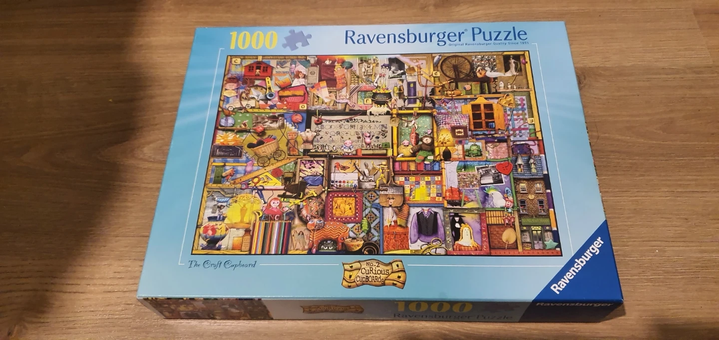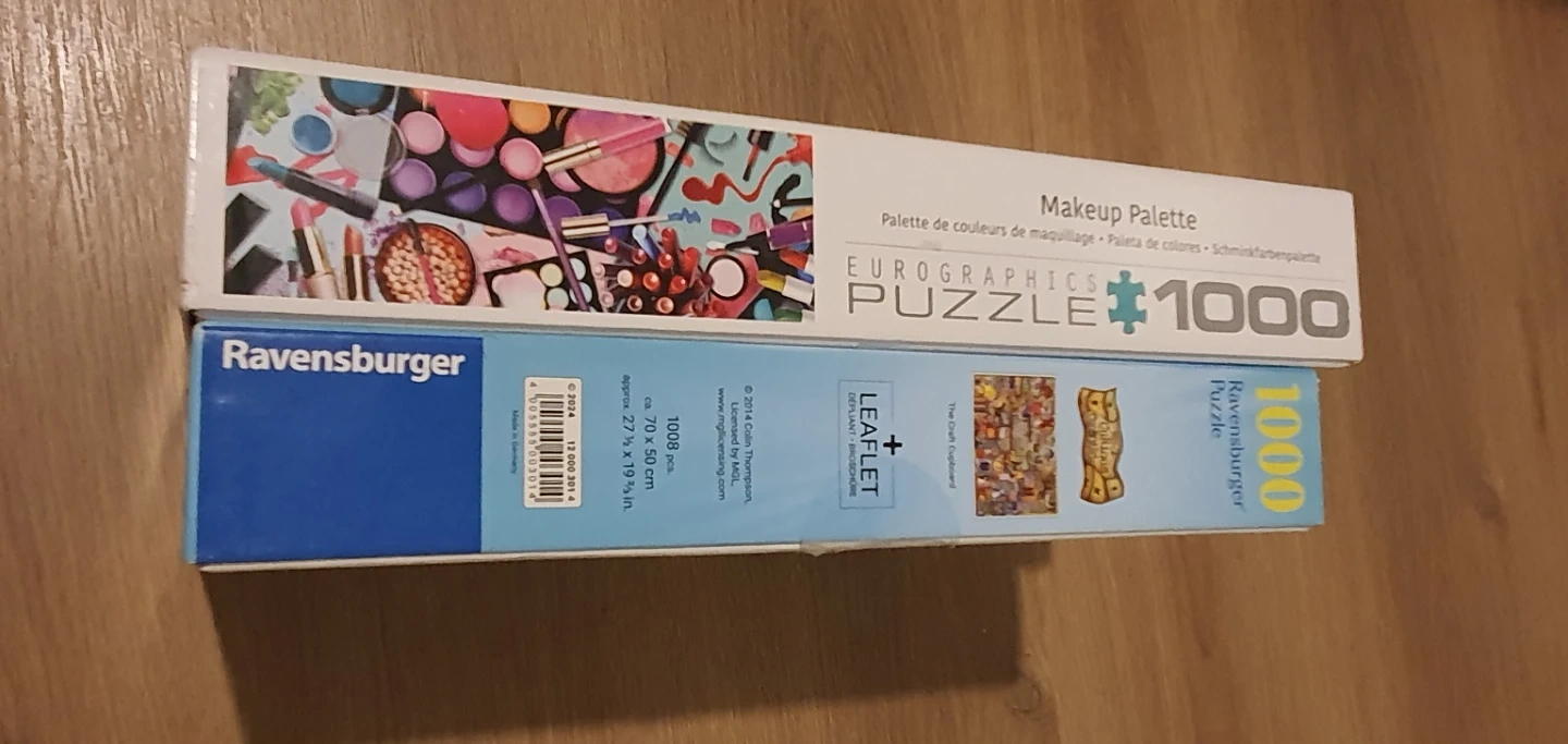 One is a Ravensburger 1000-piece puzzle, "No. 2 Curious Cupboard". The other is a Eurographics 1000-piece puzzle, "Makeup Palette". Both are in great condition and ready for a new home!