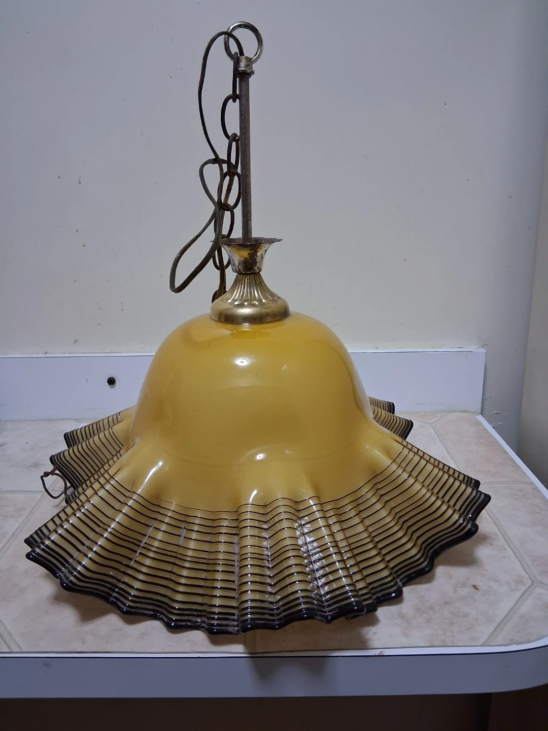 Selling a vintage 1970 murano glass pendant lamp. It features a unique ruffled edge with black stripes. It would make a great addition to any room!