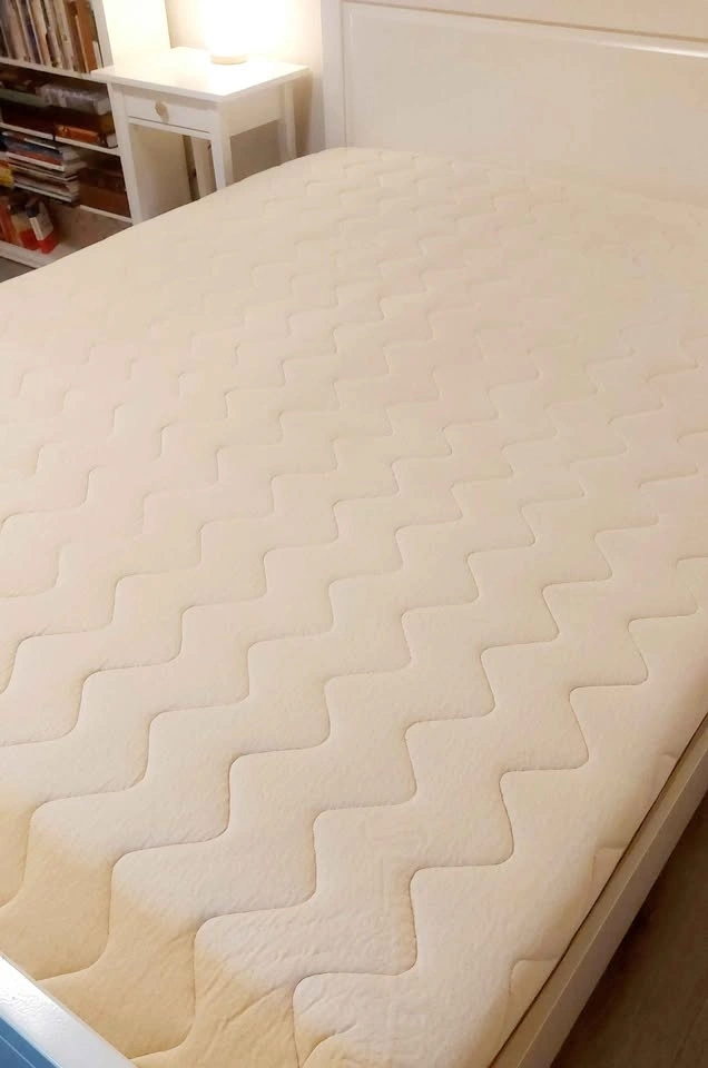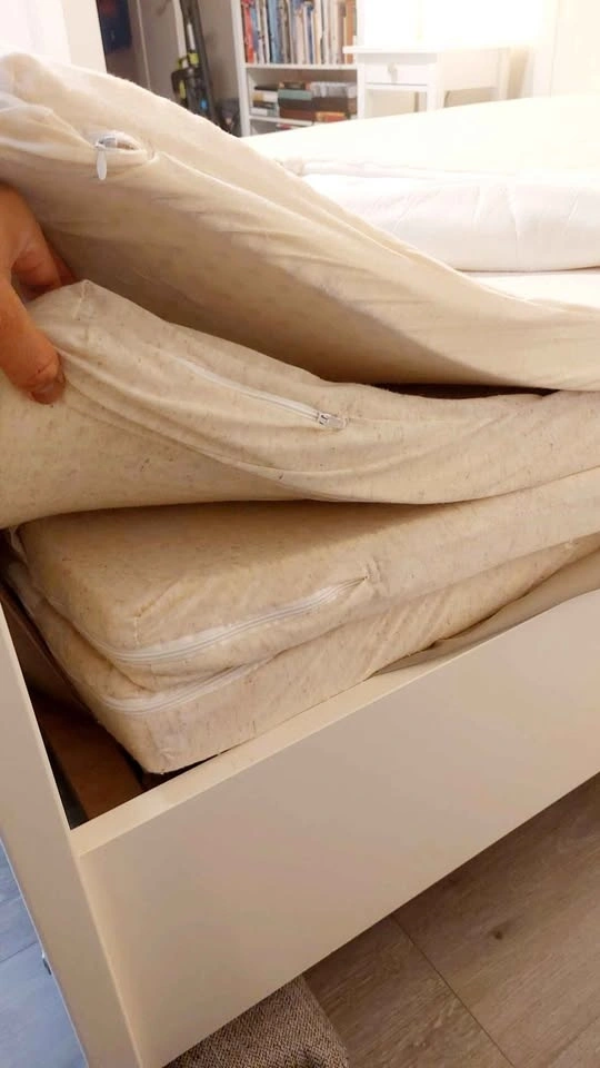 The mattress comes in 4 layers inside of an organic wool and cotton quilted cover. The layers can be rearranged for individual comfort, and each layer is replaceable as well.